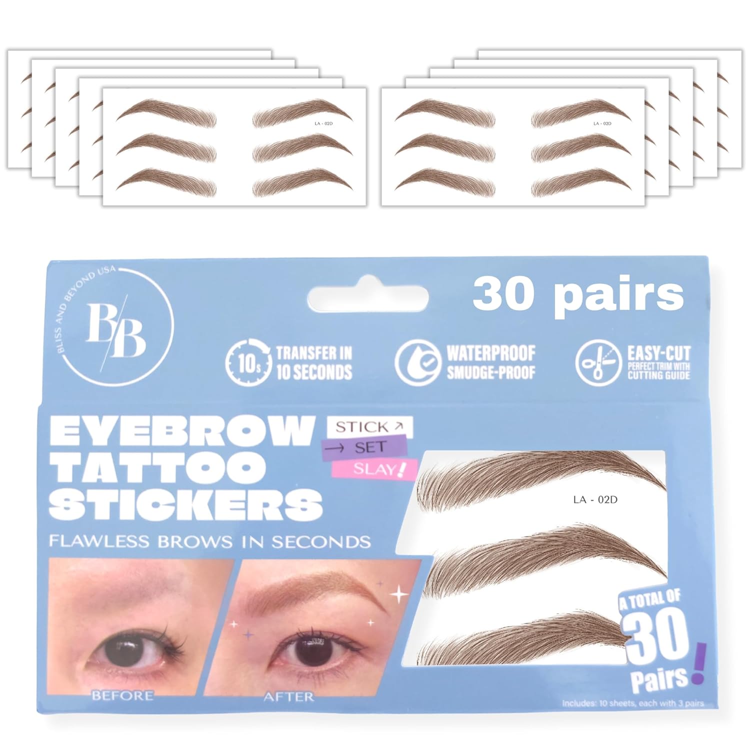 Bliss and Beyond USA Eyebrow Tattoo Stickers Waterproof – 30-Pair Deluxe Box | Realistic Hair-Like Temporary Brows for Alopecia, Cancer, and Hair Loss (Brown, Dramatic Los Angeles)