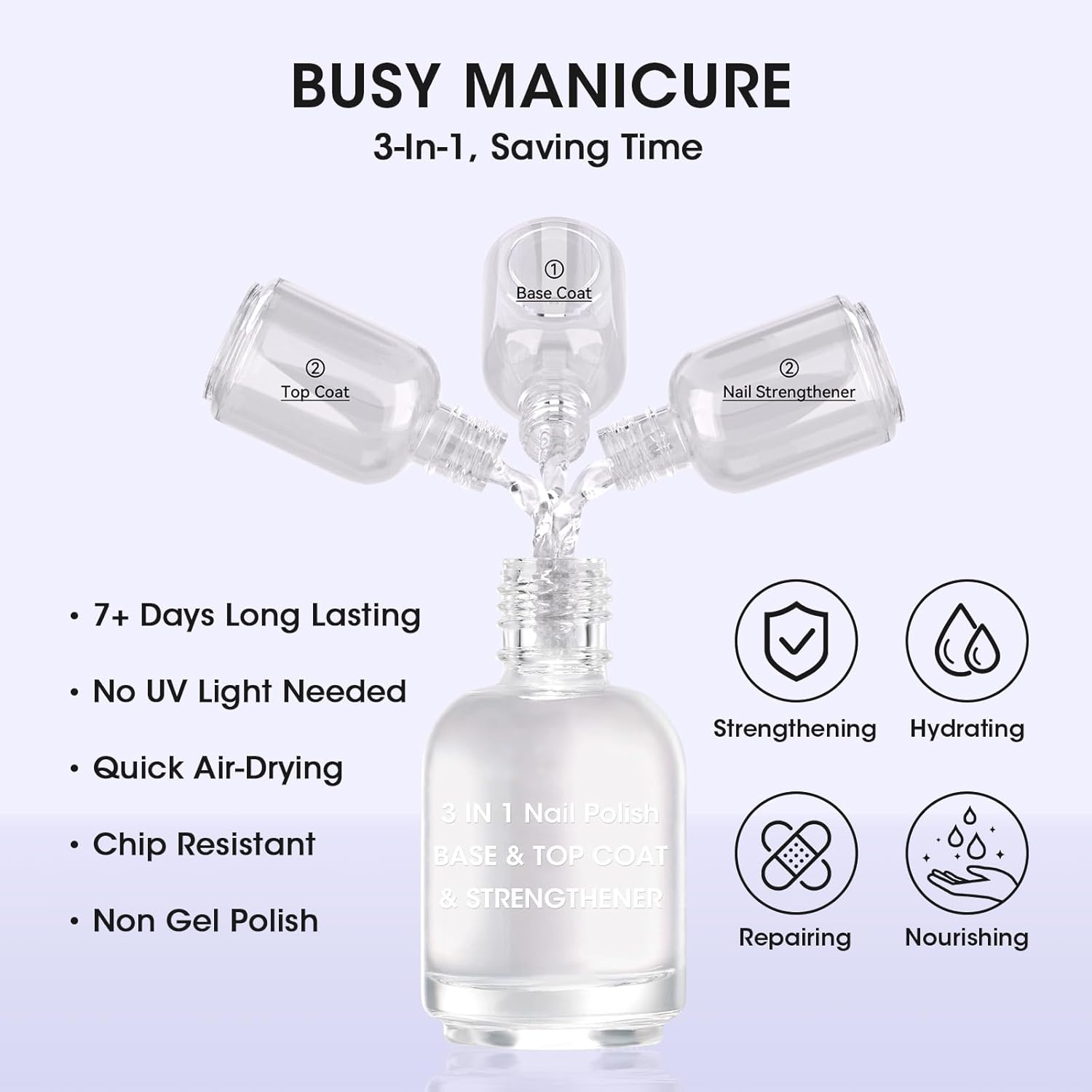 - 3-in-1 Formula: Base coat + top coat + nail strengthener in one bottle - saves time and money. Quick Air-Dry – dries fast