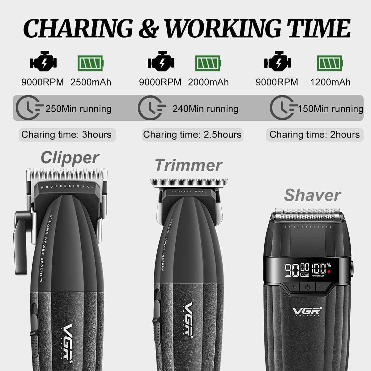 - EXTENDED BATTERY LIFE & LED DISPLAY:The hair clipper features a 2500mAh battery offering up to 250 minutes of runtime, the trimmer has a 2000mAh battery for 240 minutes, and the electric shaver includes a 1200mAh battery lasting 150 minutes. Each tool has an LED display showing real-time battery status, so you’re never caught off guard. Whether for full grooming sessions or daily touch-ups, the long-lasting battery power ensures you stay ready, anytime