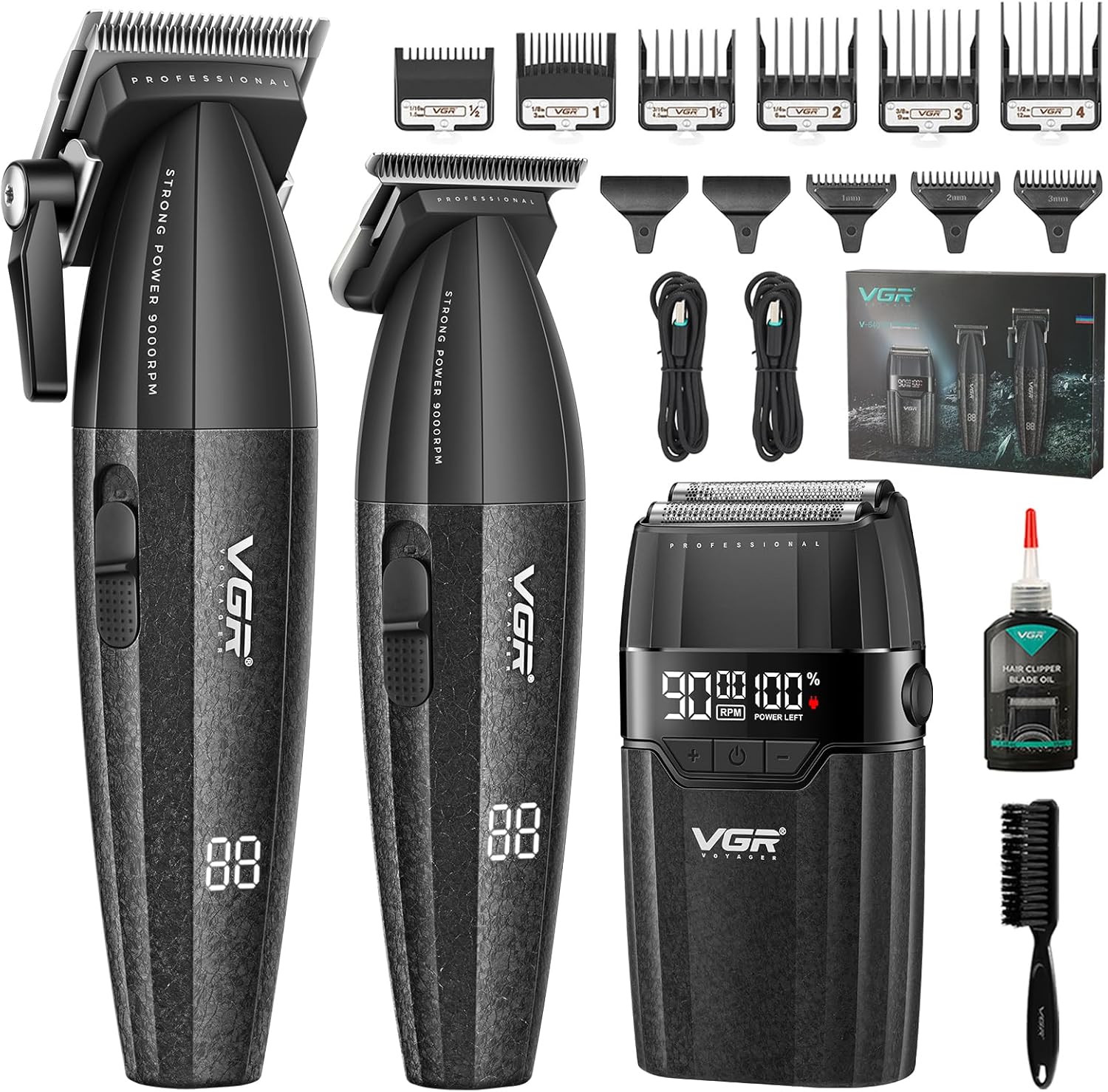- ALL-IN-ONE PROFESSIONAL GROOMING KIT:The VGR640S3 includes a powerful clipper, a precision trimmer, and a foil shaver—perfect for a complete grooming experience. Comes with 6 clipper guards (1.5–12mm), 3 trimmer guards (1–3mm), lubricating oil, cleaning brush, protective covers, and a charging cable. The clipper’s adjustable taper lever offers 5 trimming lengths, while the shaver ensures a smooth, clean finish. Ideal for barbers or at-home users seeking salon-quality results