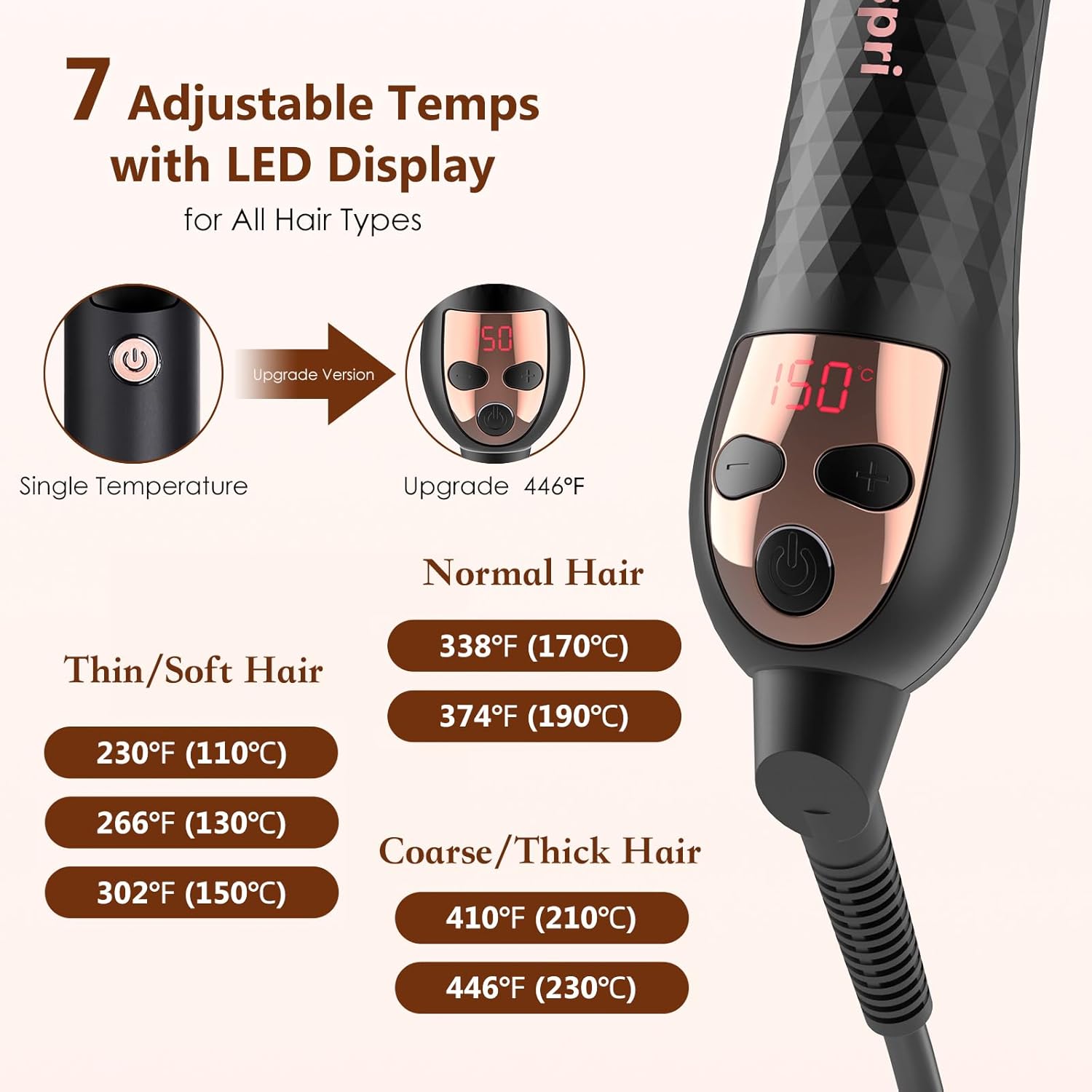- ❣️【7 Temperature Settings】This thermal brush provides up to 7 precise temperature settings(230°F-446°F)with LED display for real-time monitoring. 1.5" heated ceramic barrel adapts to all hair types, choose from 230℉, 374℉, or 446℉ to customize the heat for fine, soft hair or thick, coarse locks. Get a personalized styling experience with the right temperature for your hair. PLEASE ENSURE THAT THE BRUSH HEAD IS PROPERLY INSTALLED AND LOCKED SO THAT THE PRODUCT CAN WORK NORMALLY.