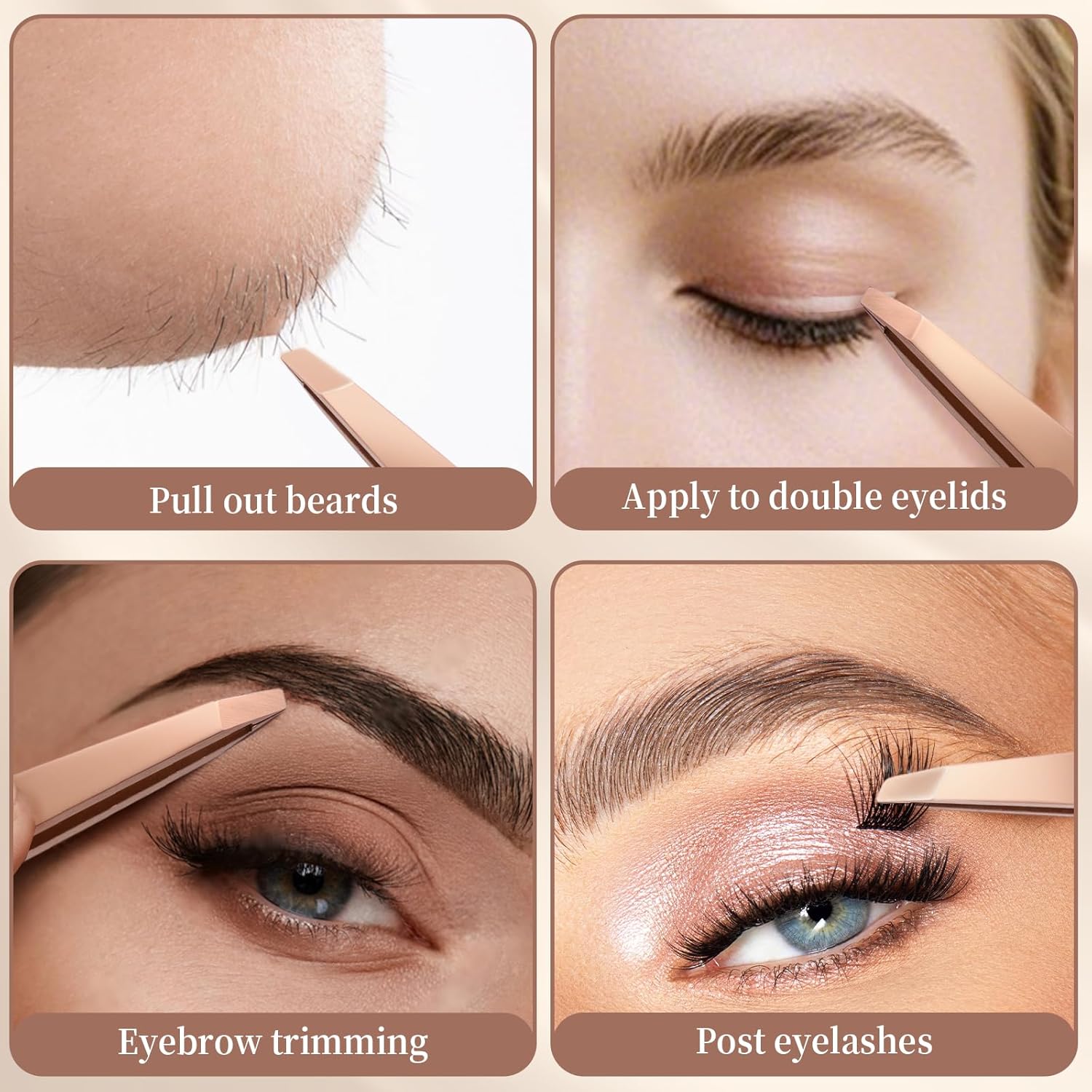 Precision Stainless Steel Tweezer for Eyebrows, Facial Hair and Fine Hairs Removal, Slant Tip Eyebrows Tweezers with Leather Case (Rose Gold)