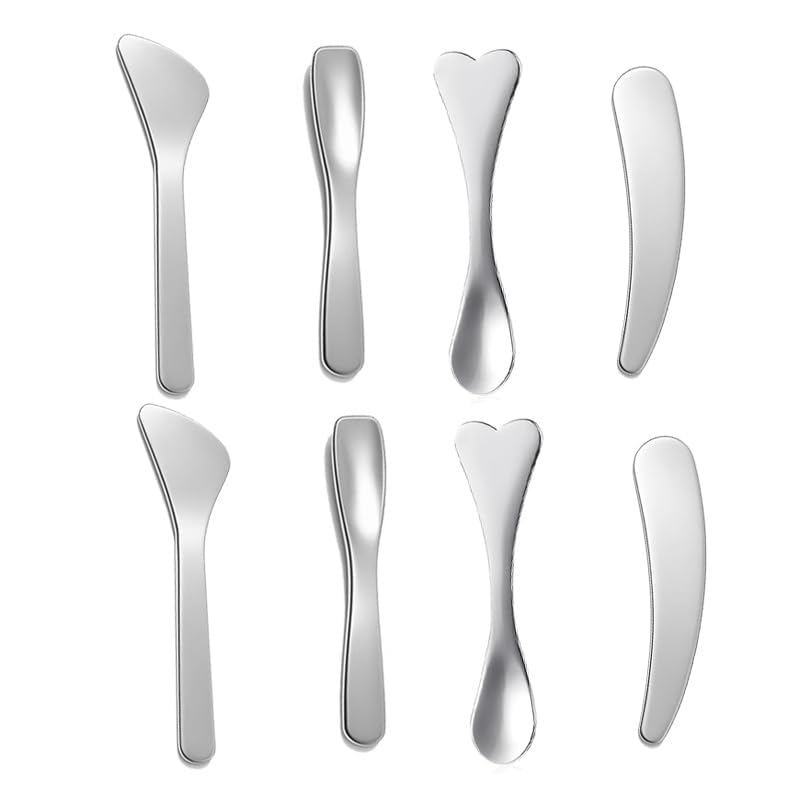 - 1.Essential Cosmetic Tool 4 kinds of mini stainless steel cosmetic spatulas, 8pcs totally, there are 2pcs with each knids of beauty spatula.Each with unique and practical shapes that fit the cheek well and are easy to use. These small makeup spatulas are perfect for scooping out small amounts of product from jars or pots, helping you maximize the usage of your favorite cosmetics, providing right tools for precise application of skincare and beauty products.
