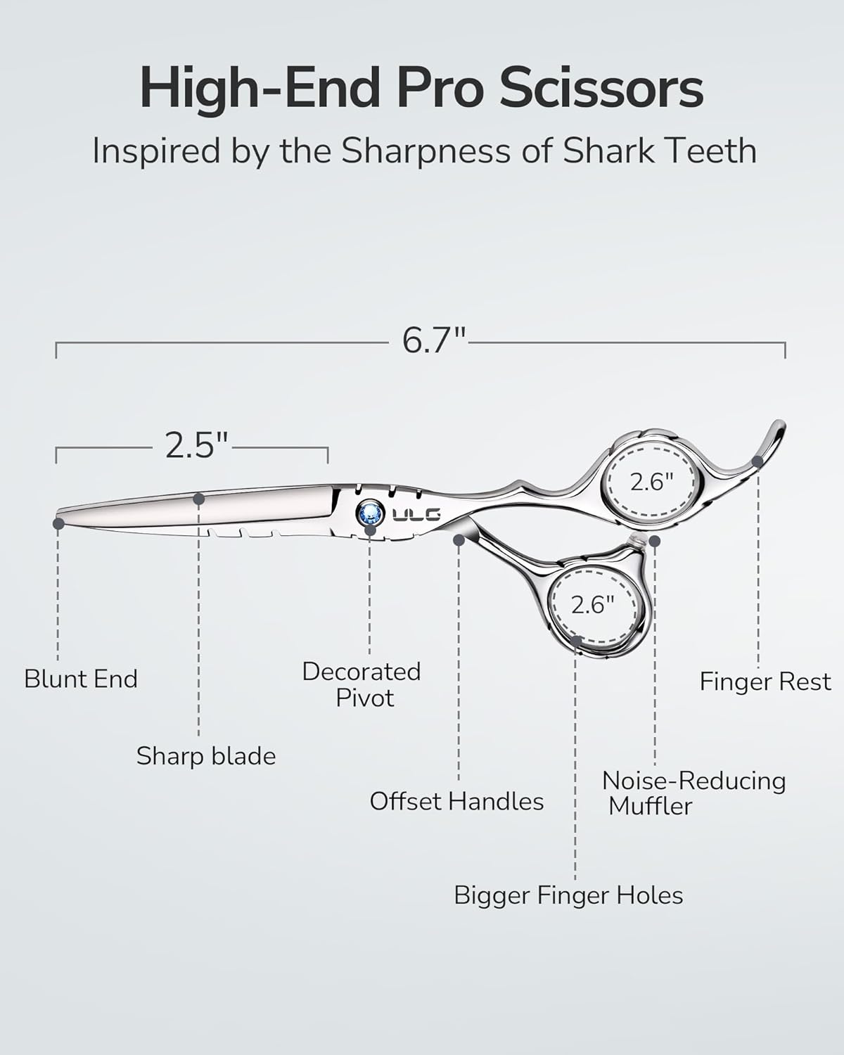 ULG Hair Cutting Scissors 6.7” Shark Series, 100% Japanese Stainless Steel Ultra Sharp, Concave Blade Barber Shears, Ergonomic Offset Handle, Professional Salon Haircut Scissors for Home & Salon Use