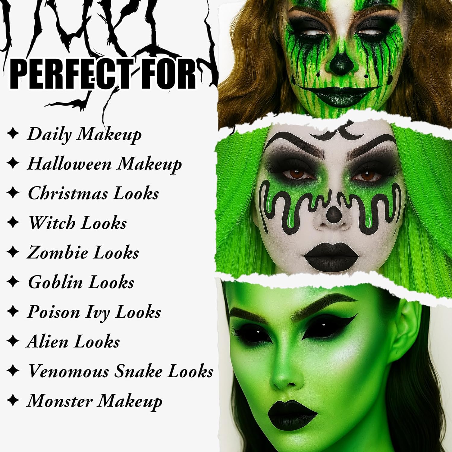 - GREEN MAKEUP KIT - Unleash bold character transformations with the complete kit– Green Edition. Whether you’re channeling an enchanted forest witch, alien invader, poison ivy goddess, or a spooky swamp creature, this full-face makeup set gives you the tools to craft mesmerizing Halloween looks with high-impact color and professional-grade finishes.
