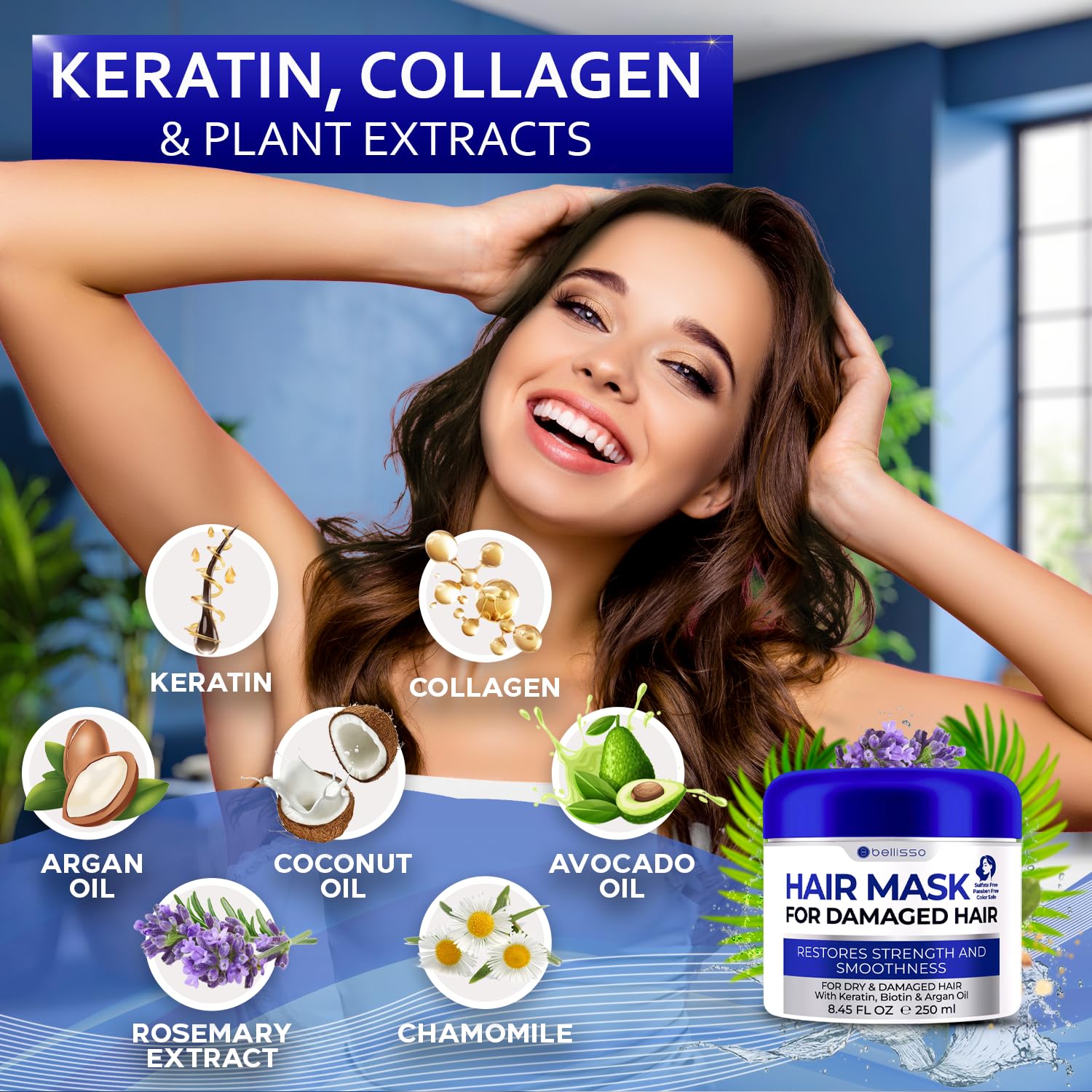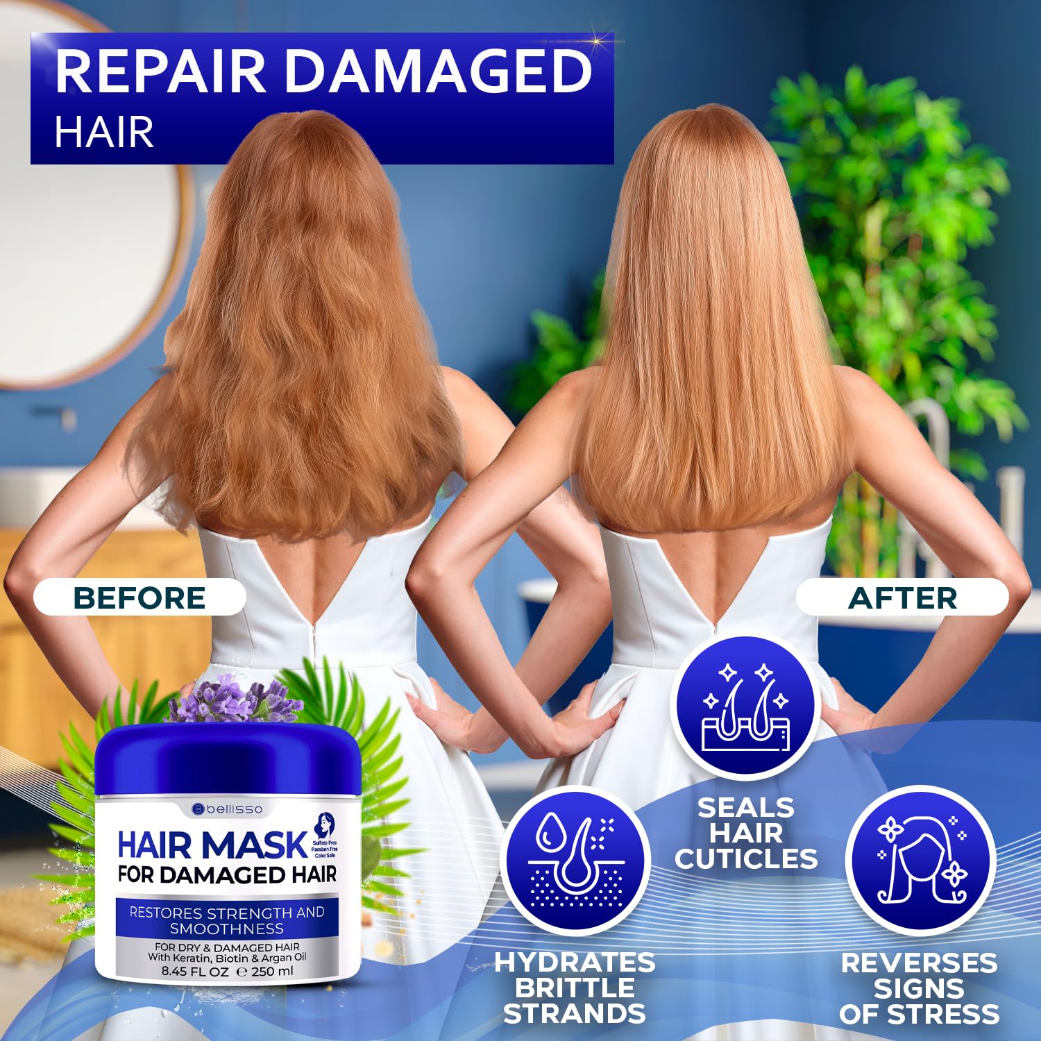 BELLISSO Hair Mask for Damaged Hair - Deep Conditioning and Moisturizing Repair Treatment for Dry Split Ends and Breakage - Hydrating Moisturizer Products for Women and Men - 8.45 Fl Oz