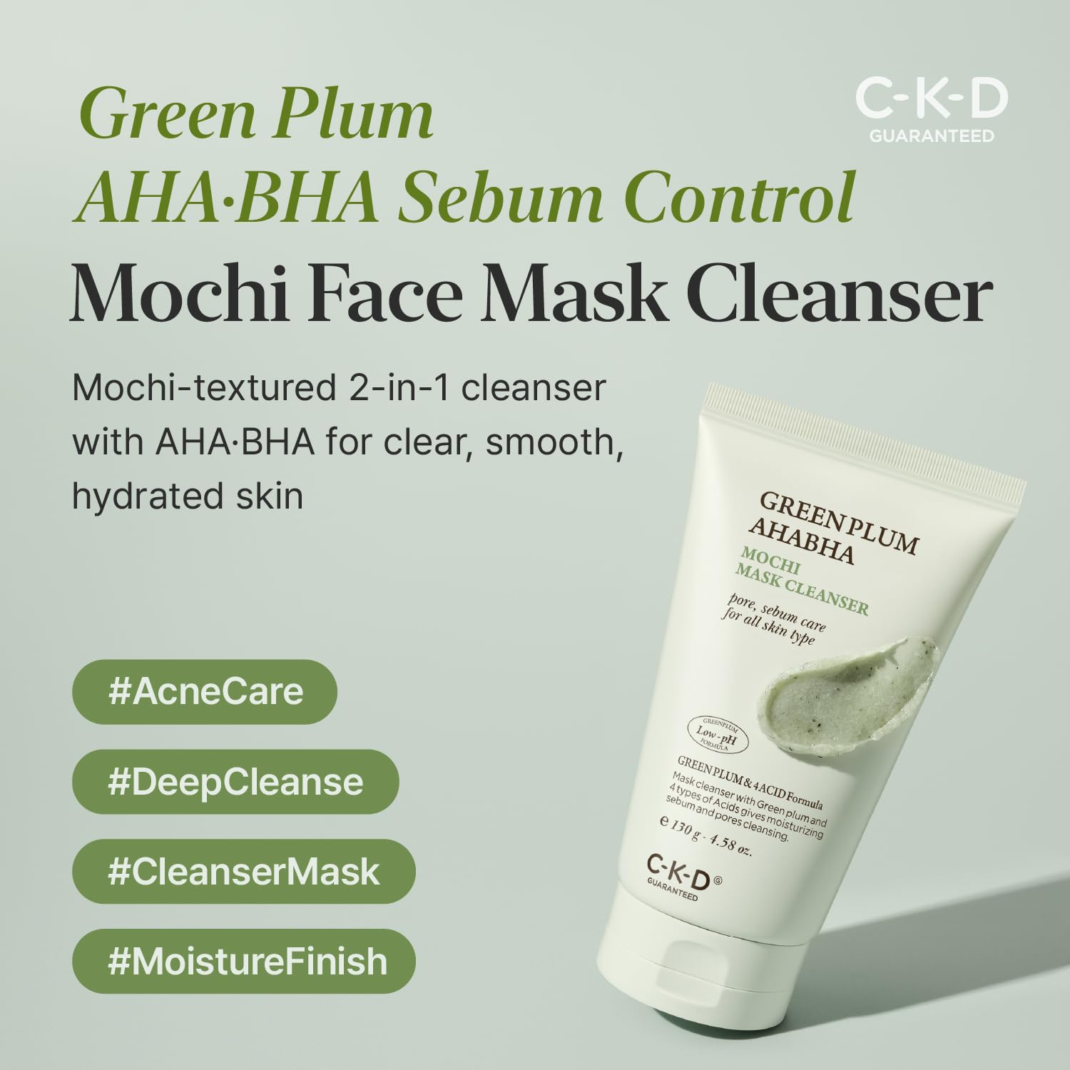 CKD Green Plum AHA·BHA Clay Mask Cleanser - All in One, Korean Face Wash + Makeup Remover + Gentle Scrub with Controls Sebum, Tightens Pores, Removes Blackheads. All Skin Types. 4.58 oz