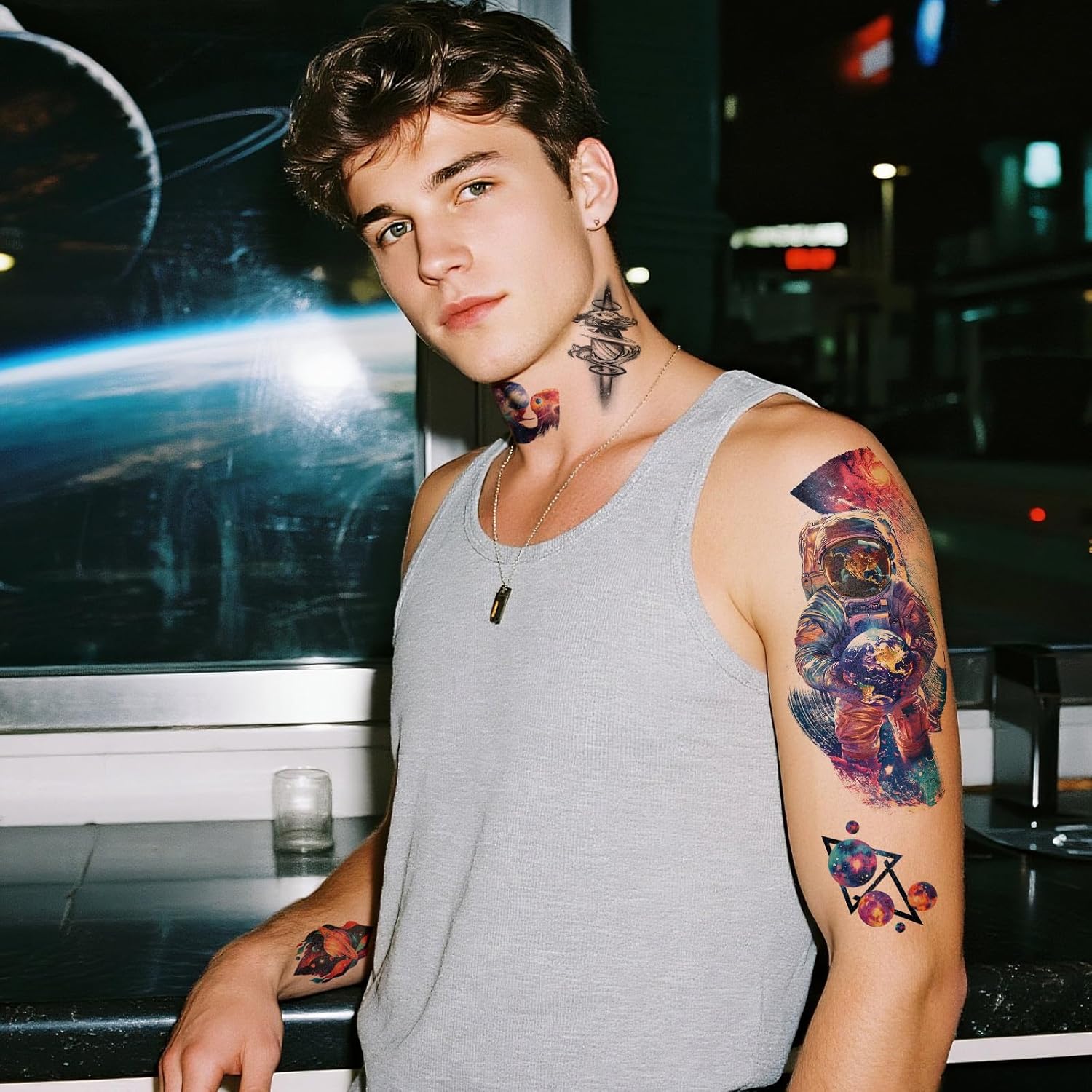 77 Sheets Temporary Tattoos, 17 Sheets Space Planet Astronaut Rockets Half Arm Fake Tattoo for Adults Men Women, 60 Sheets Small Waterproof Lasting Stickers Tattoo for Boys Girls Kids Party