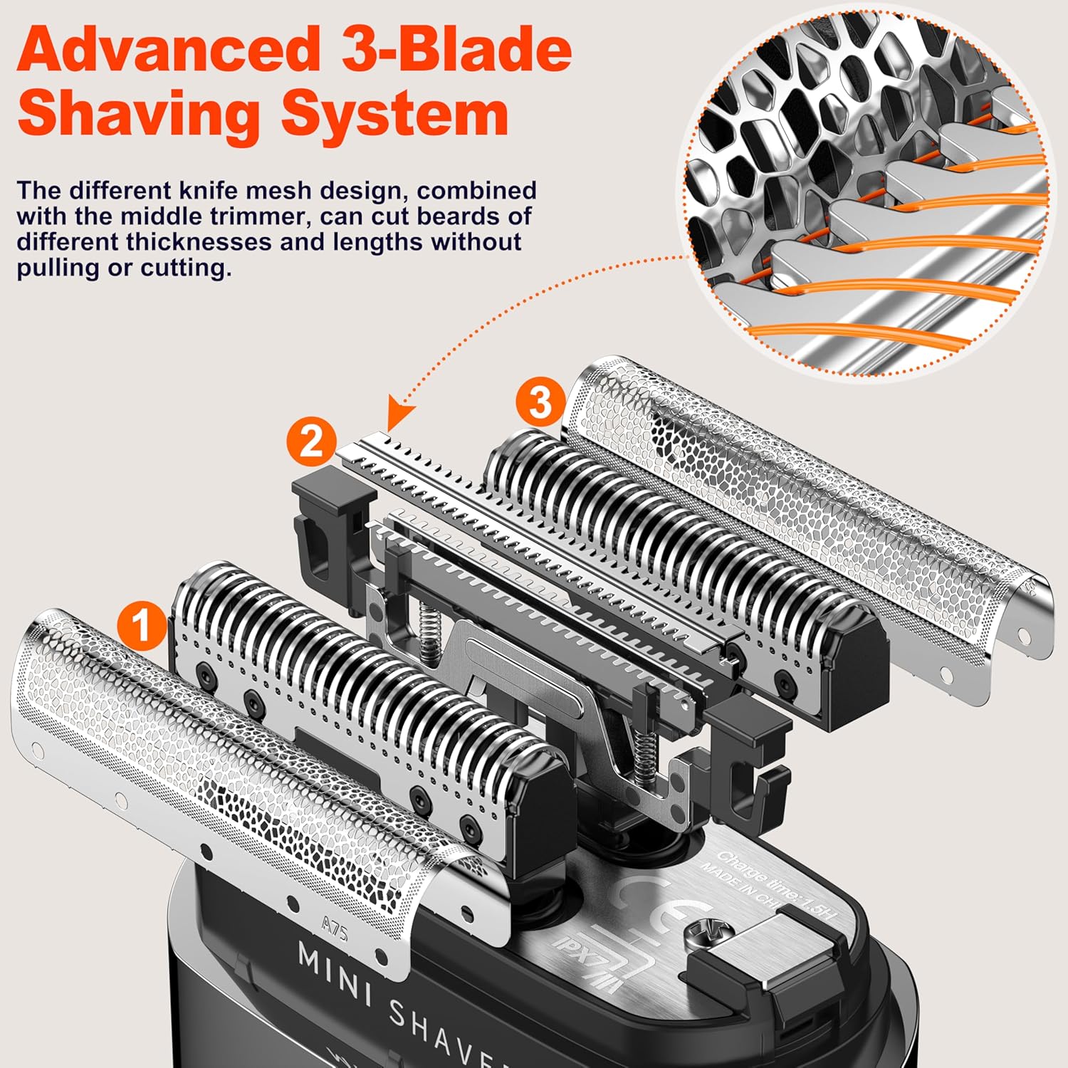 - Precision Close Shaving Experience: After numerous ergonomic tests, we designed the ideal knife net and the blade layout. The men's electric shavers can capture more short and thick beard, easily trim the hair of the face, neck, jaw or even bald head without pulling. The skin-friendly razor blade let you enjoy a smooth and clean shave without skin irritation.