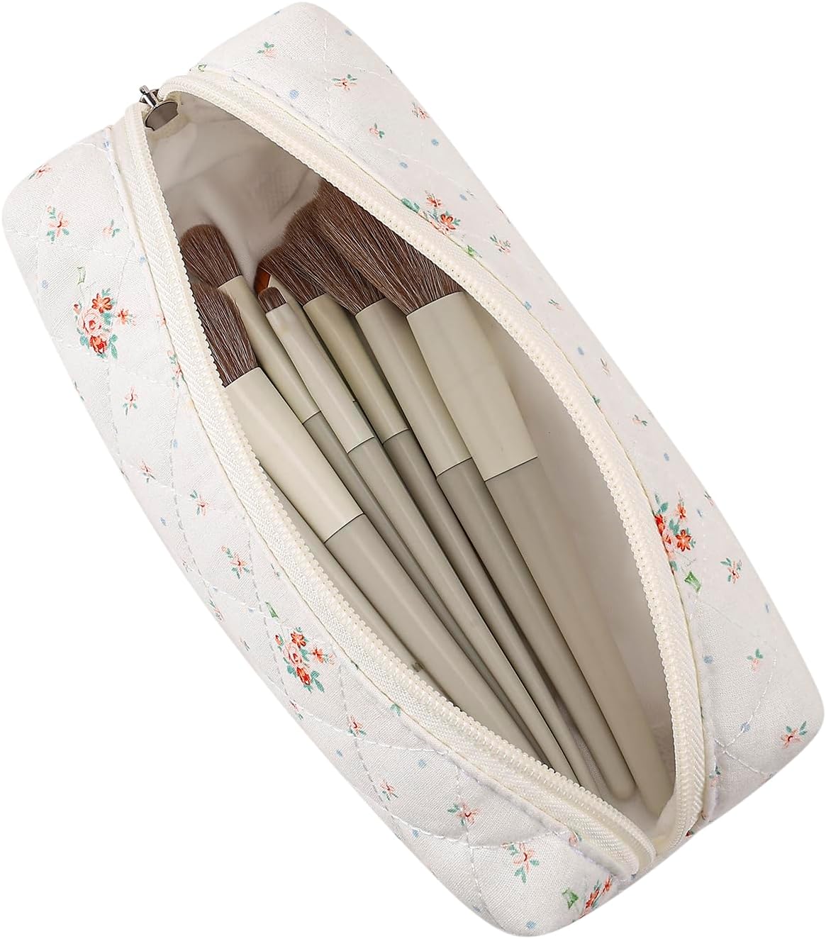 Cute Floral Cotton Makeup Brush Cosmetic Bag for Women, Travel Quilted Zipper Make Up Bag, Flowers Toiletry Organizer Case Kawaii Makeup Cosmetic Travel Cloth Pouch (White Small Flower)