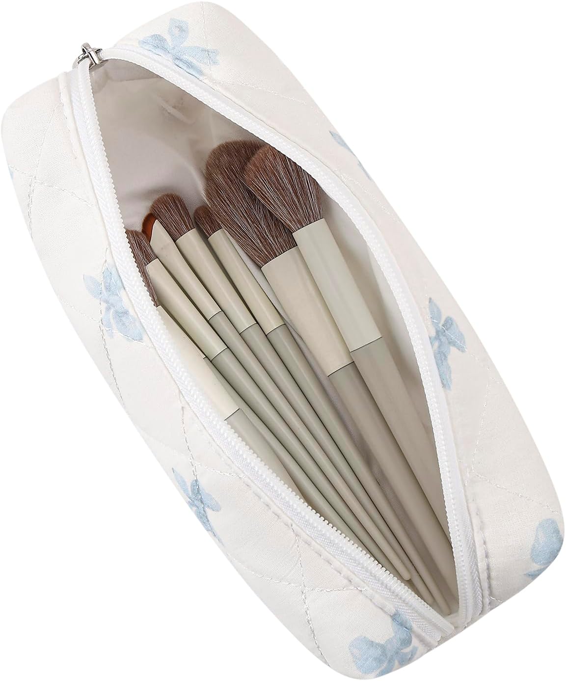 Cute Floral Cotton Makeup Brush Cosmetic Bag for Women, Travel Quilted Zipper Make Up Bag, Flowers Toiletry Organizer Case Kawaii Makeup Cosmetic Travel Cloth Pouch (Pink Bow Tie+Blue Bow Tie)
