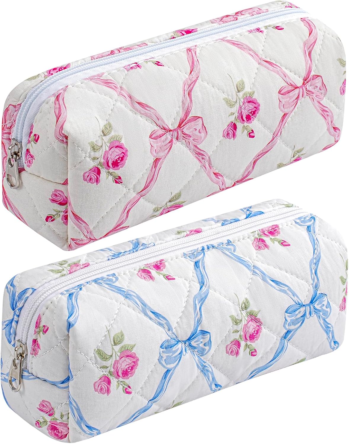 Cute Floral Cotton Makeup Brush Cosmetic Bag for Women, Travel Quilted Zipper Make Up Bag, Flowers Toiletry Organizer Case Kawaii Makeup Cosmetic Travel Cloth Pouch (Pink Bowknot+Blue Bowknot)