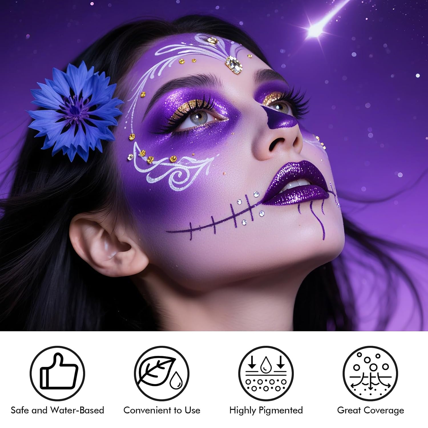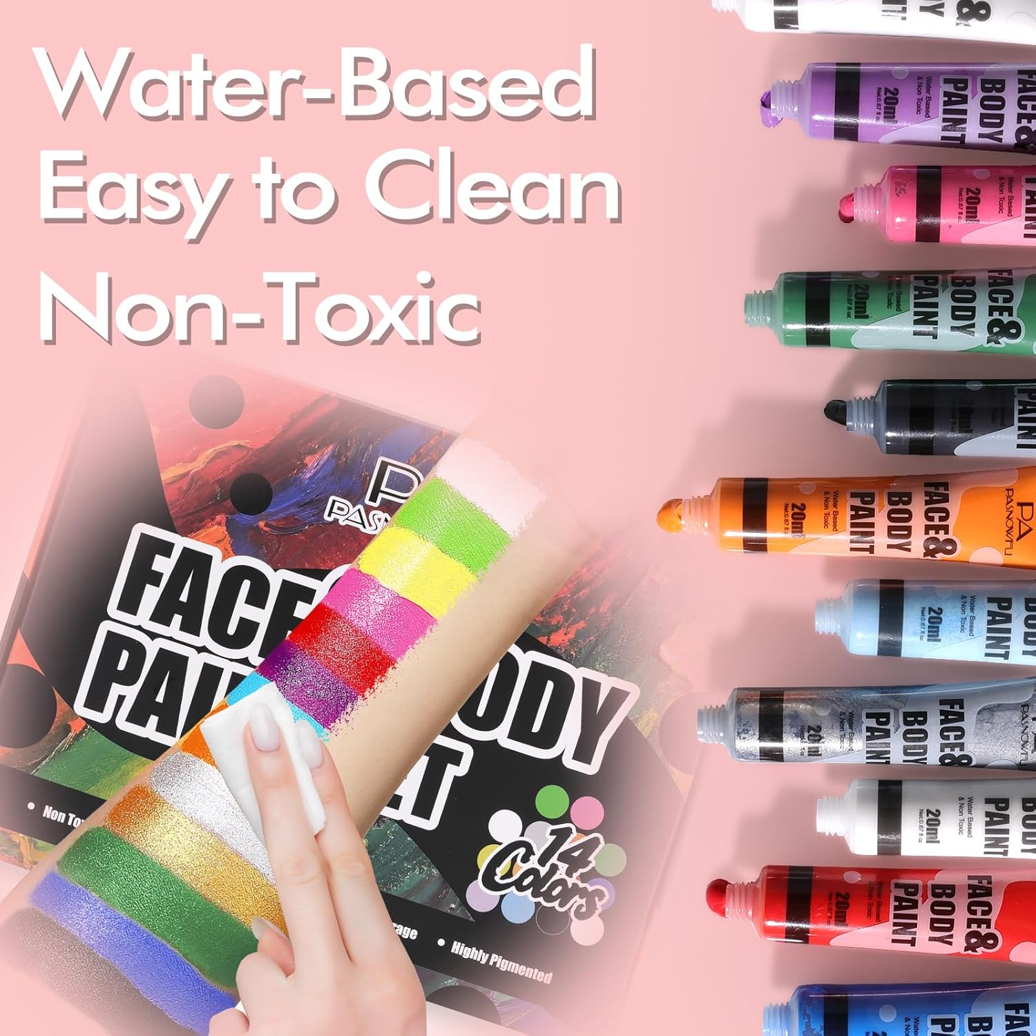 - [Safe and Water-Based Face Painting ] This is a water-based face body painting product. It uses a safe and non-toxic formula and is suitable for most skin types. You can use it with confidence. However, there are individual differences in skin sensitivity. It is recommended to conduct a small-scale skin test before use