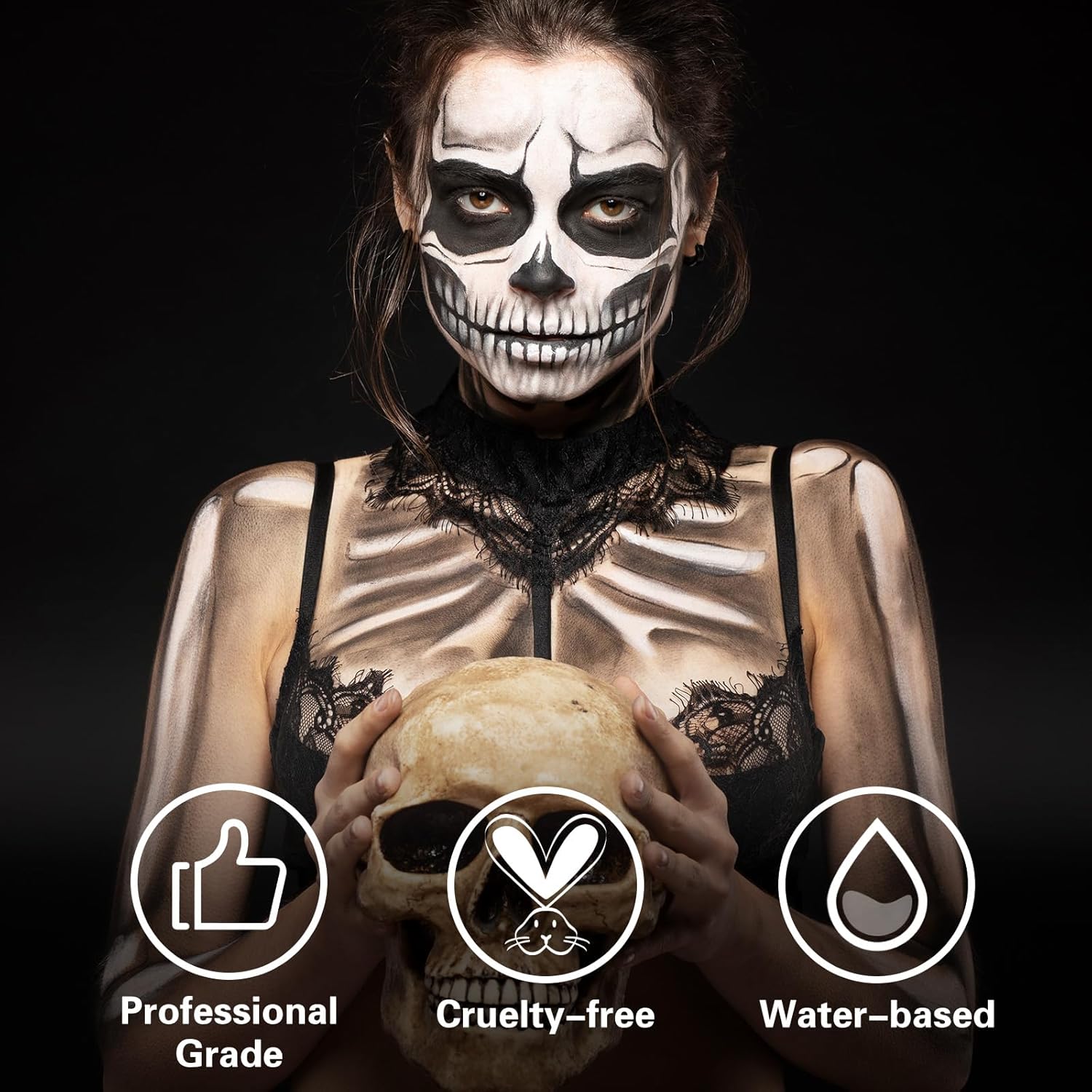 BOBISUKA Black and White Face Body Paint Kit, Water Based Face Painting for Halloween Clown Skeleton Joker Zombie Mime Sugar Skull Makeup for Women Adults, Non-Toxic Washable