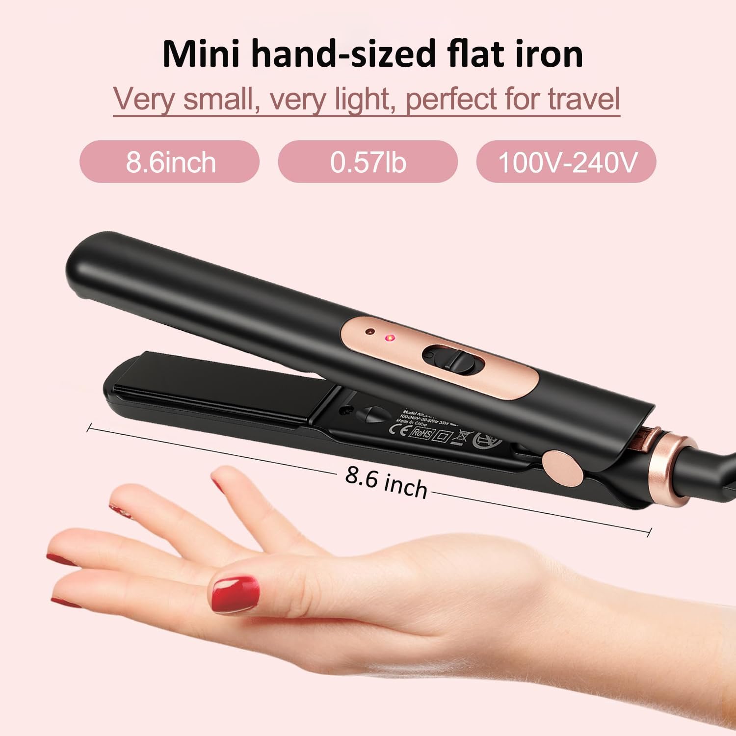 - 【Travel Flat Iron for Hair Mini】This travel hair straightener is the ultimate travel companion,the length of the body is 8 inches, and the weight is only 0.57 pounds,offers 110-240 V dual voltage,so this can be used anywhere in the world,its lightweight and portable enough for international travel