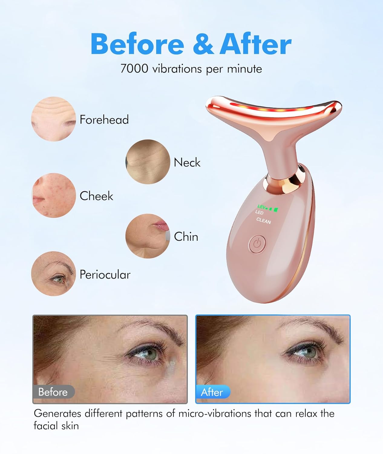 Red Light Therapy for Face and Neck, 7 Color Face Massager Tool for Wrinkles, Double Chin, Vibrating Facial Massager with Thermals for Skin Care, Rose Gold