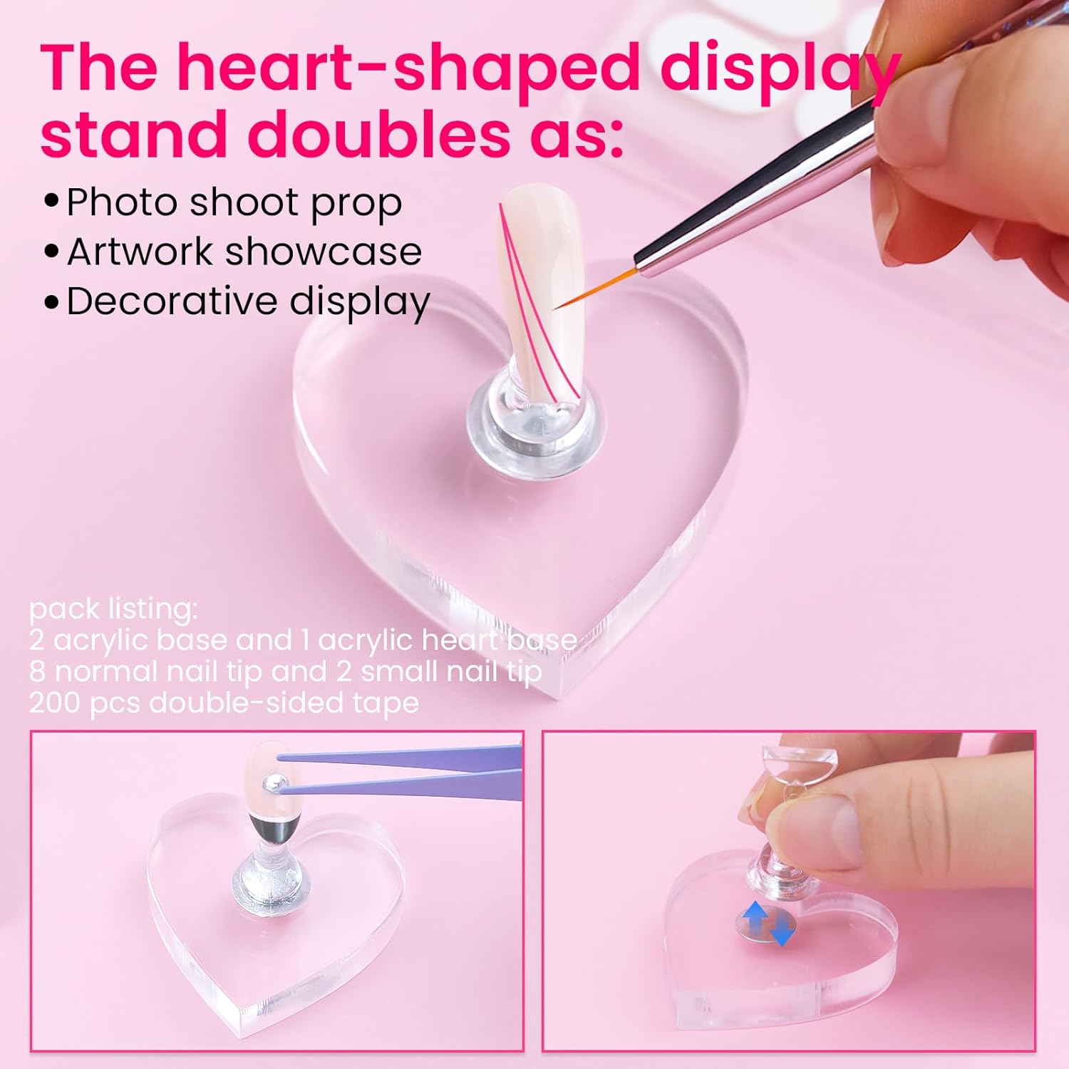 - Nail Holder for Painting Nails Pro Kit: Elevate your nail art game with our deluxe set—2 acrylic nail art stands, 1 heart-shaped press on nail stand, and 200 durable double-sided tapes! Perfect for salon pros, DIYers, or glitter-obsessed beginners—turn any space into a mini nail studio