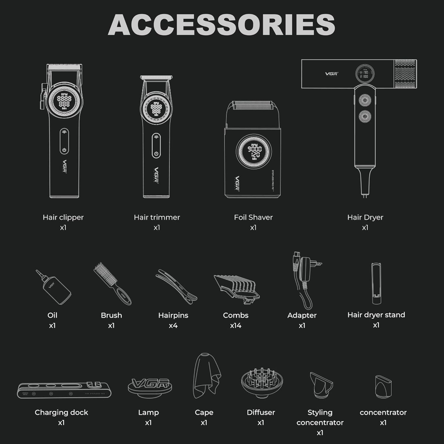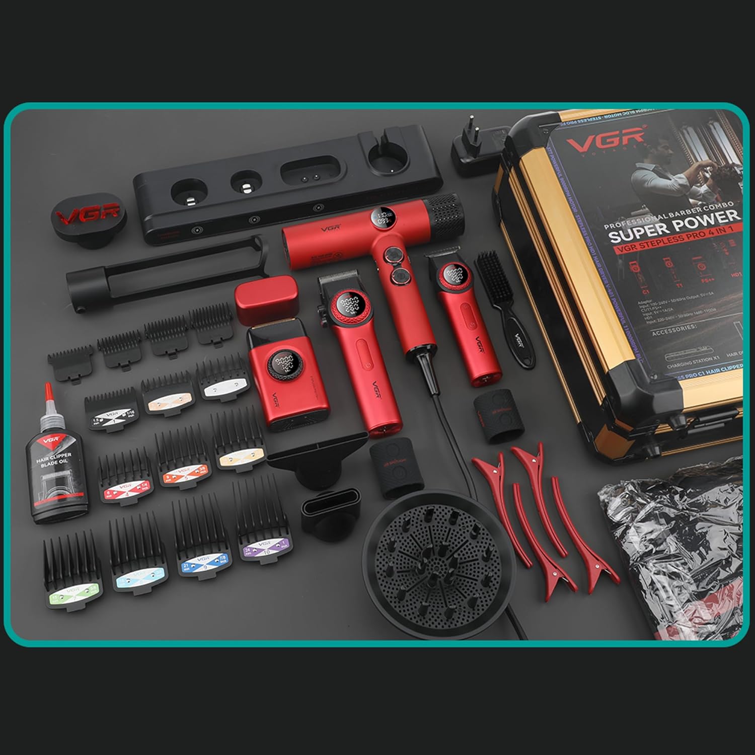 - 4-in-1 Professional Grooming Kit with All Accessories: The VGR STEPLESS Pro 4 in 1 grooming set includes a cordless hair clipper (VGR 001), hair trimmer (VGR 977), foil shaver (VGR 378), and hair dryer (VGR 401). This comprehensive kit provides everything you need for haircuts, trims, clean shaves, and hair drying, perfect for professional barbers and home users. It also includes 10 cutting guides (1.5mm to 24mm) for the clipper, 4 guide combs (1.5mm to 6mm) for the trimmer, cleaning brush, lubricating oil, charging dock, hair dryer stand, adapter, VGR lamp, cape, 4 hairpins, diffuser, concentrator, and styling concentrator