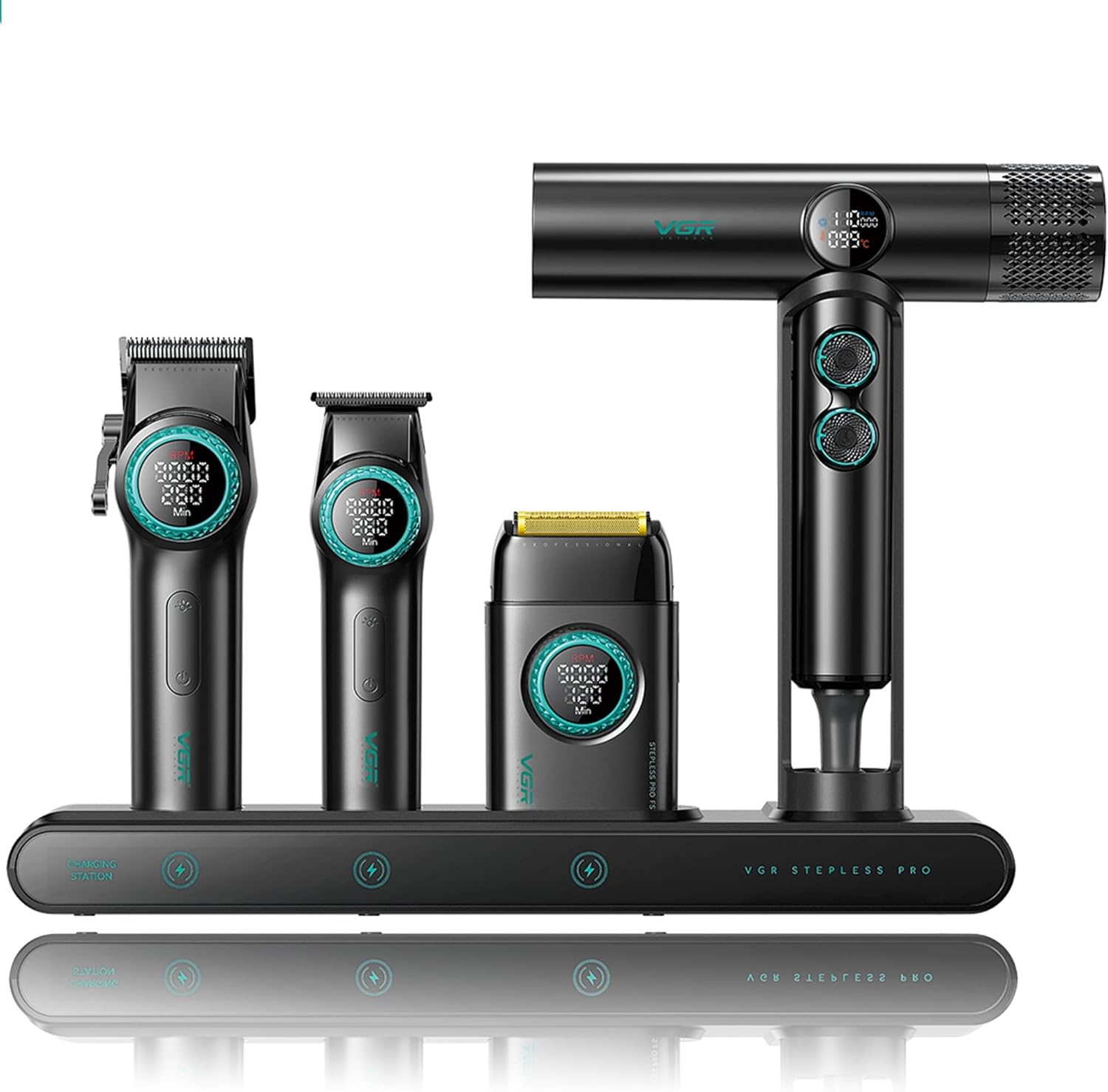 - 4-in-1 Professional Grooming Kit with All Accessories: The VGR STEPLESS Pro 4 in 1 grooming set includes a cordless hair clipper (VGR 001), hair trimmer (VGR 977), foil shaver (VGR 378), and hair dryer (VGR 401). This comprehensive kit provides everything you need for haircuts, trims, clean shaves, and hair drying, perfect for professional barbers and home users. It also includes 10 cutting guides (1.5mm to 24mm) for the clipper, 4 guide combs (1.5mm to 6mm) for the trimmer, cleaning brush, lubricating oil, charging dock, hair dryer stand, adapter, VGR lamp, cape, 4 hairpins, diffuser, concentrator, and styling concentrator