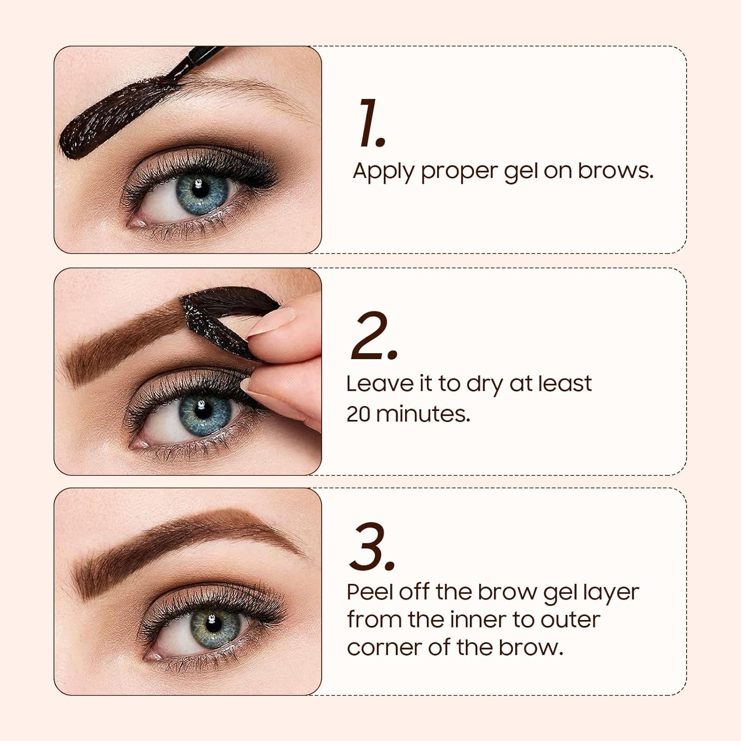 - 【EASY TO USE】Using the eyebrow brush, apply a layer of brow gel onto the eyebrows, ensuring even coverage. Wait patiently for 20 minutes, then peel off to reveal full and refined eyebrows. And then you can save time and enjoy 3 days with defined eyebrows. Attention: If you want to have long-lasting eyebrows, please do not use cleaning products on your eyebrows within 24 hours.