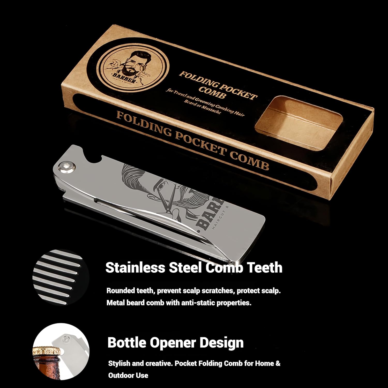 Metal Hair & Beard & Mustache Comb, Multifunctional Folding EDC Pocket Comb With Bottle Opener - Anti-Static for Travel and Everyday Grooming Styling - Silver