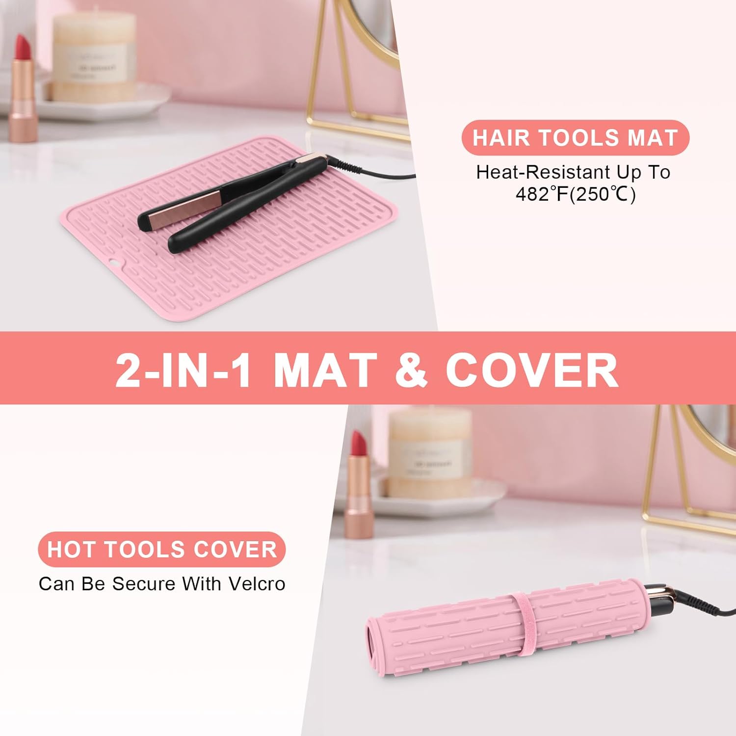 - Heat-Resistant Material: Our silicone mat for hair tools is made of heat-resistant silicone, which withstands temperatures up to 482℉(250℃), providing a reliable barrier to protect your countertops and vanity from the intense heat of curling irons, flat irons, hair straighteners and hot hair styling tools