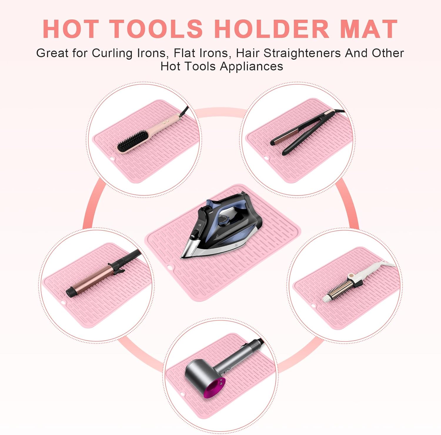 - Product Benefits : Heat Resistant Silicone, Extra Large Size, Durable and Non-Slip, Comes with Velcro, Convenient for Travel and Storage, Uses for Multiple Hot Hair Tools Heat Resistant Silicone, Extra Large Size, Durable and Non-Slip, Comes with Velcro, Convenient for Travel and Storage, Uses for Multiple Hot Hair Tools