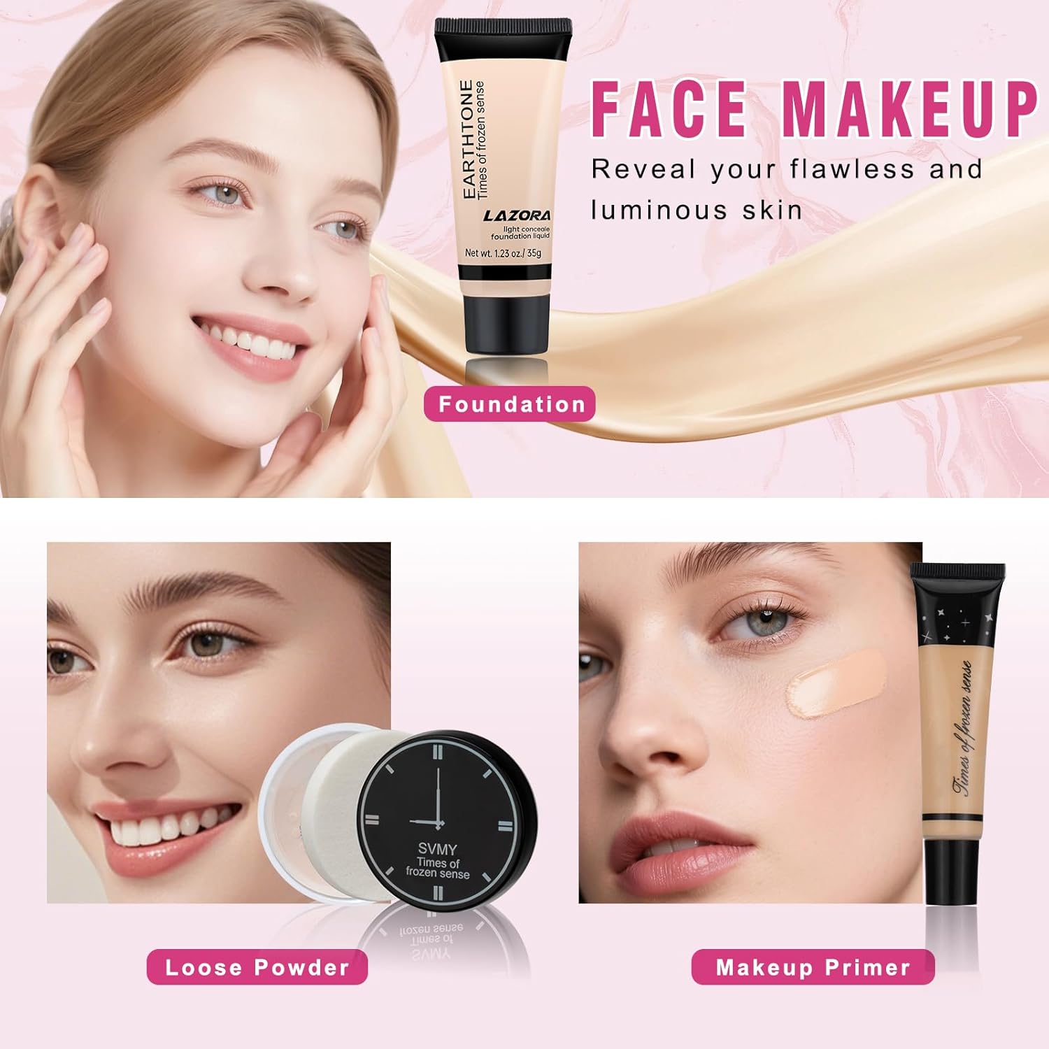 - 【All in One Makeup Kits】This Makeup Gift Set includes everything you need for a full-face look: facial cleansing brush*1, foundation*1, setting spray*1, loose powder*1, eyebrow pencil*1, mascara*1, eyeliner*1, concealer*1, lip liner*1, lip gloss*2, Makeup base*1, makeup palette*1, powder puff*1, cosmetic brush*8. One set can solve all your facial makeup