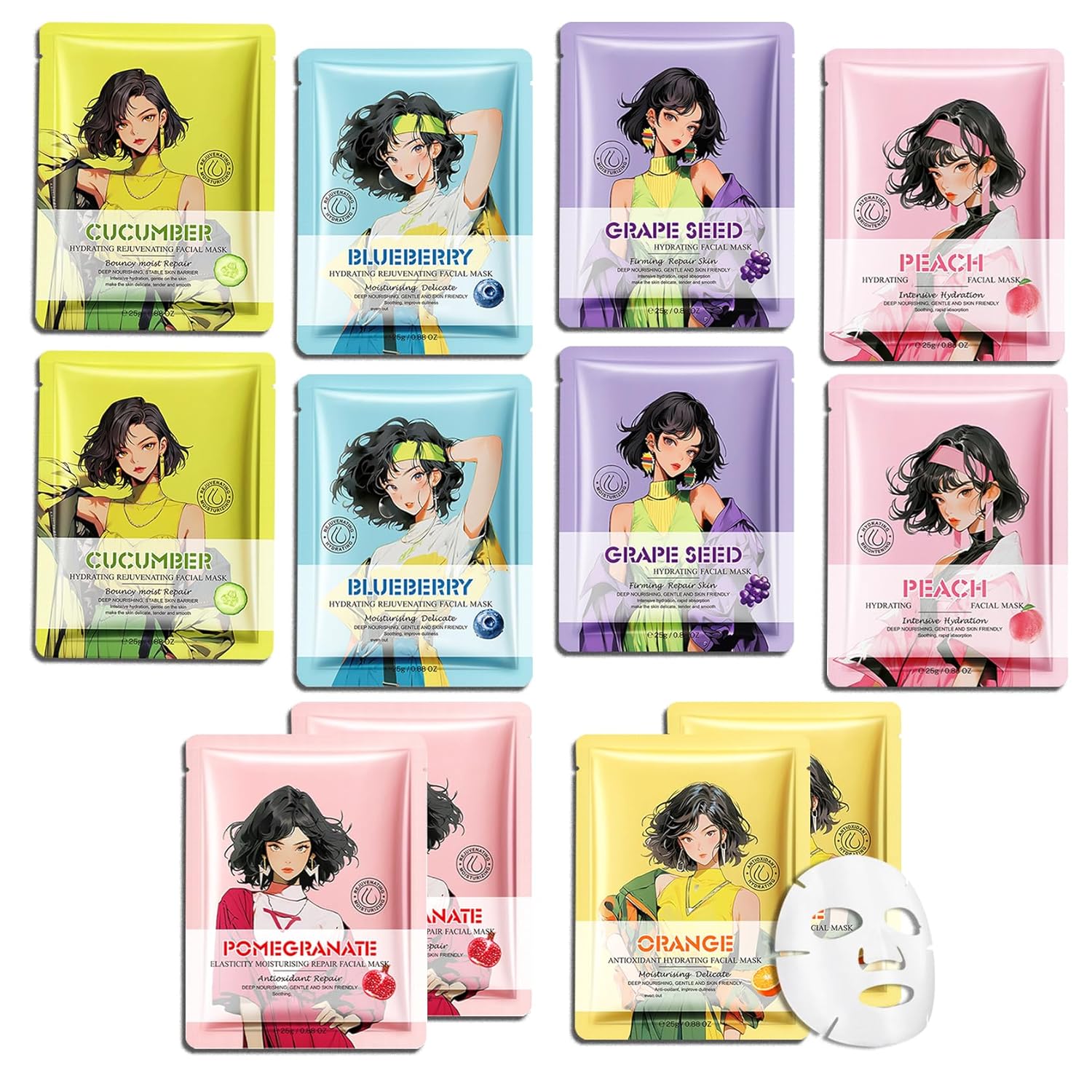 12PCS Hydrating Facial Sheet Mask,Moisturizing Face Masks Skincare Gift Set,Long Lasting Face Mask Skin Care & Facial Mask Kit for All Skin Types 19