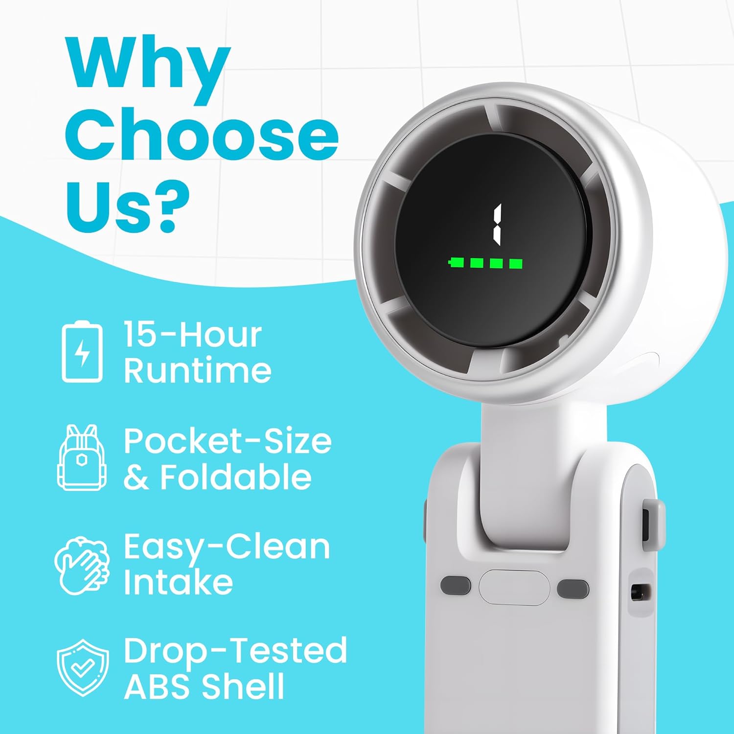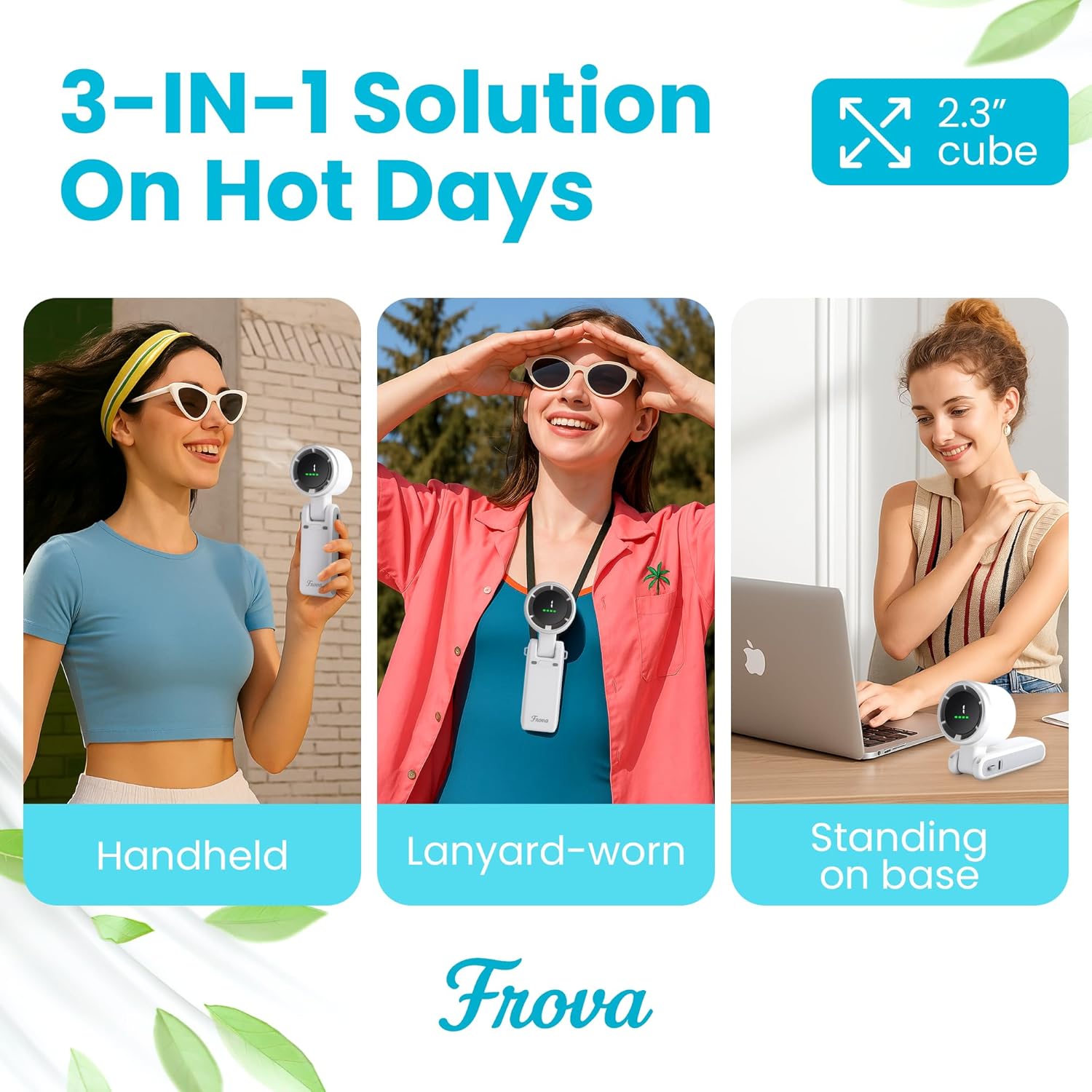 - Pocket-Sized, 3-in-1 Versatility Weighing just 110 g, it folds into a compact 2.3″ cube. Use it as a freestanding fan, clip it into its own stand, or wear it hands-free with the soft-touch lanyard—perfect for queues, stroller walks, or gym sessions. No tools needed.