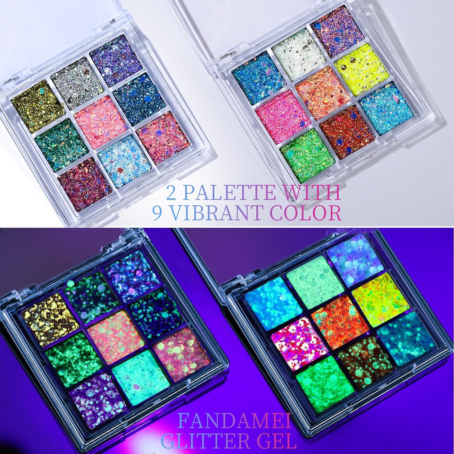 FANDAMEI Glow in The Dark Glitter, 2 Glitter Gel Palette 18 Grids Face Body Hair Glitter for Glow in The Dark Glitter Makeup, Face Glitter for Kids Women for Halloween Rave Concert Face Paint