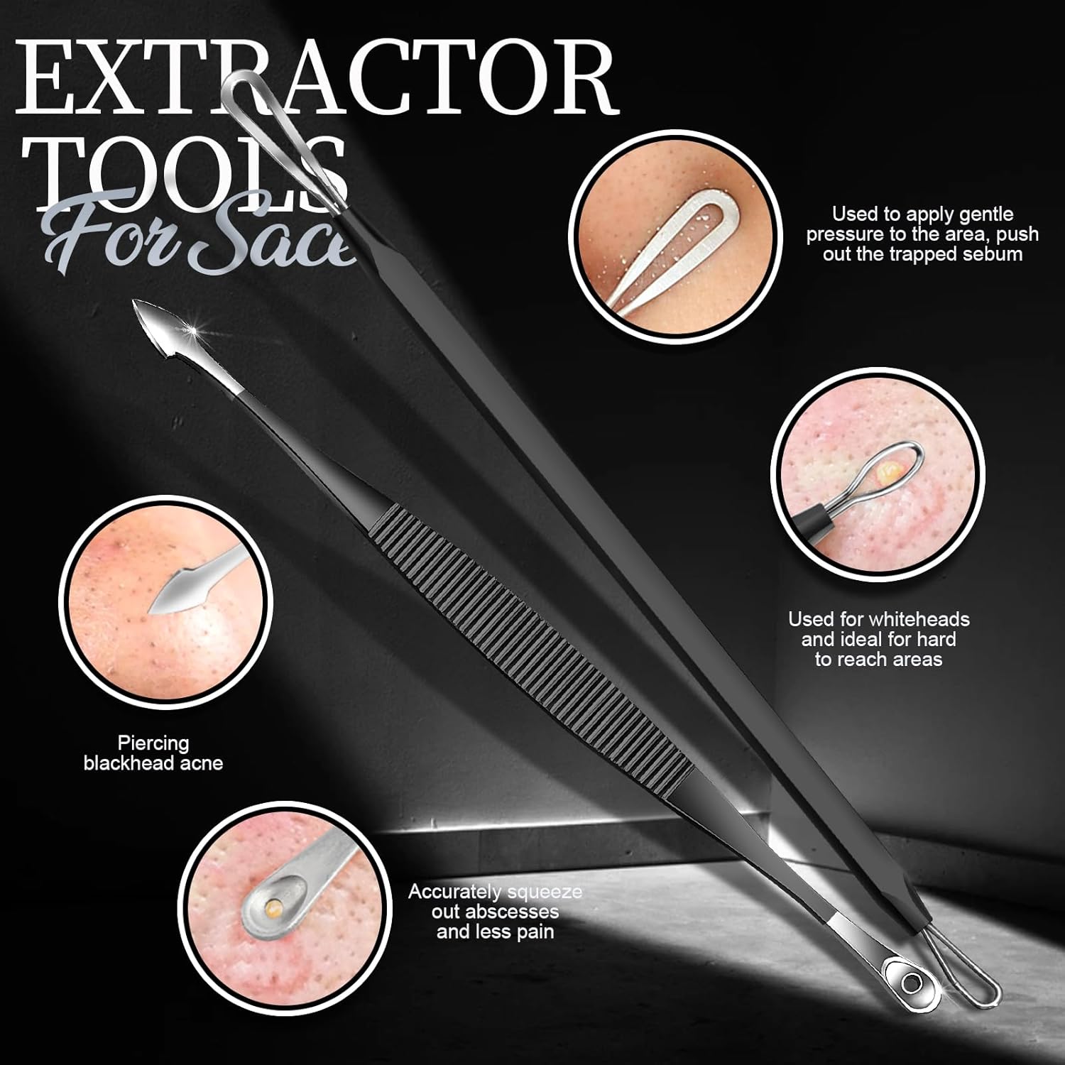- Extraction Tools For Estheticians: All acne & black head remover for face tool are well organized in a handy leather case with instruction manual, convenient to carry and traveling. ATTENTION! Always be gentle to avoid damaging your face skin. Never apply excessive pressure. We suggest to use the facial kit only after the acne is matured