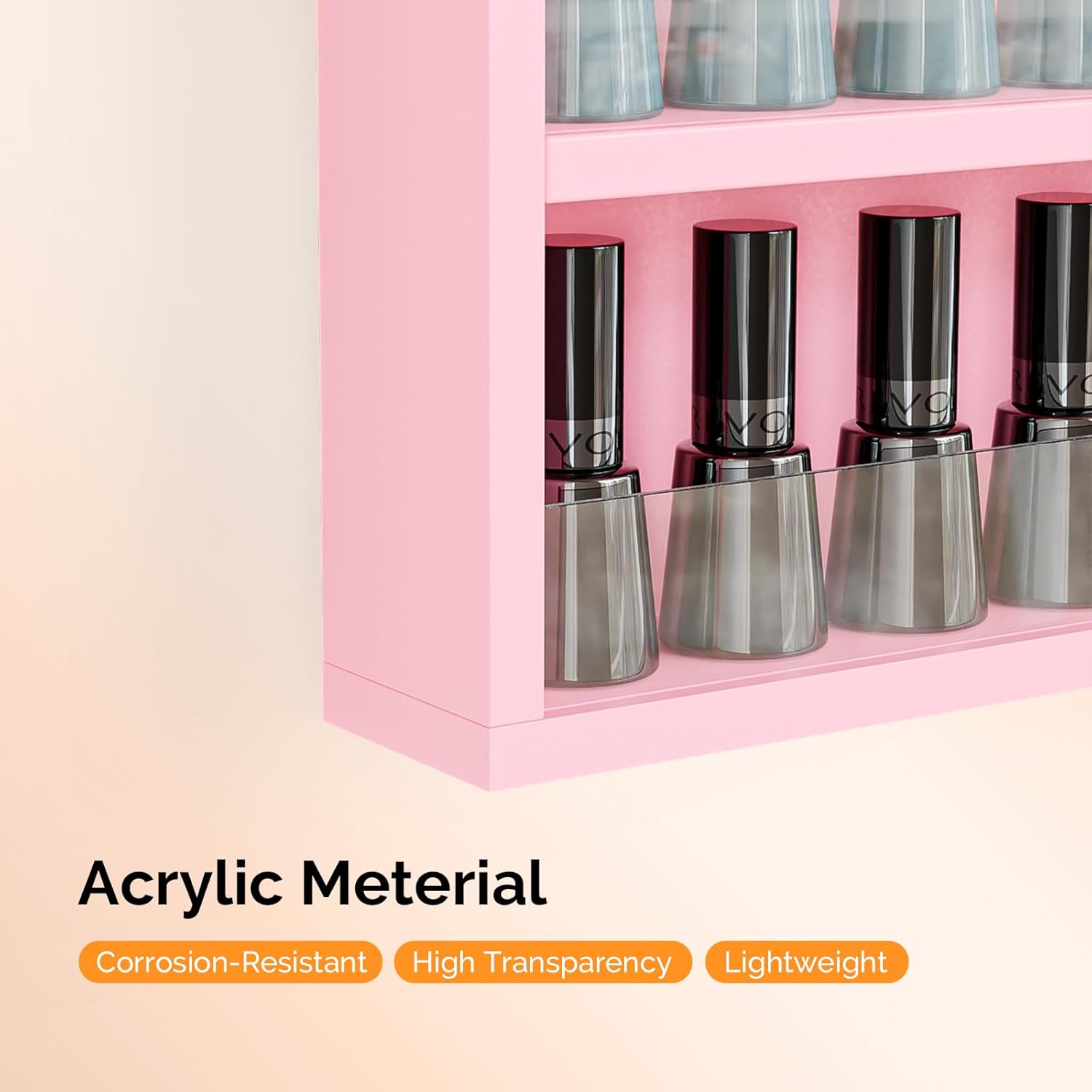 - ACRYLIC BAFFLES: The shelf dividers are made of transparent acrylic material, which is lightweight, durable, and easy to clean. At the same time, it can display the items on the nail polish rack more clearly and beautifully.