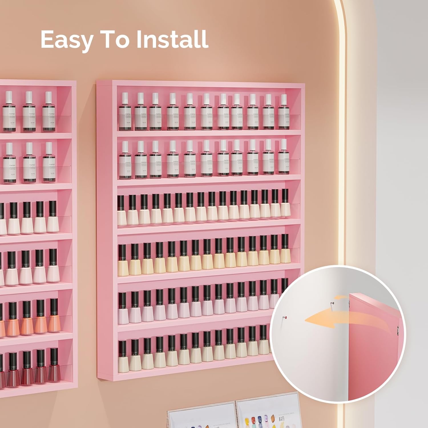 - STURDY & DURABLE: The integrated design, along with its lightweight construction, allows this nail polish rack to be securely mounted on the wall. The nail salon display is made of MDF material, ensuring it is acetone resistant and will long last