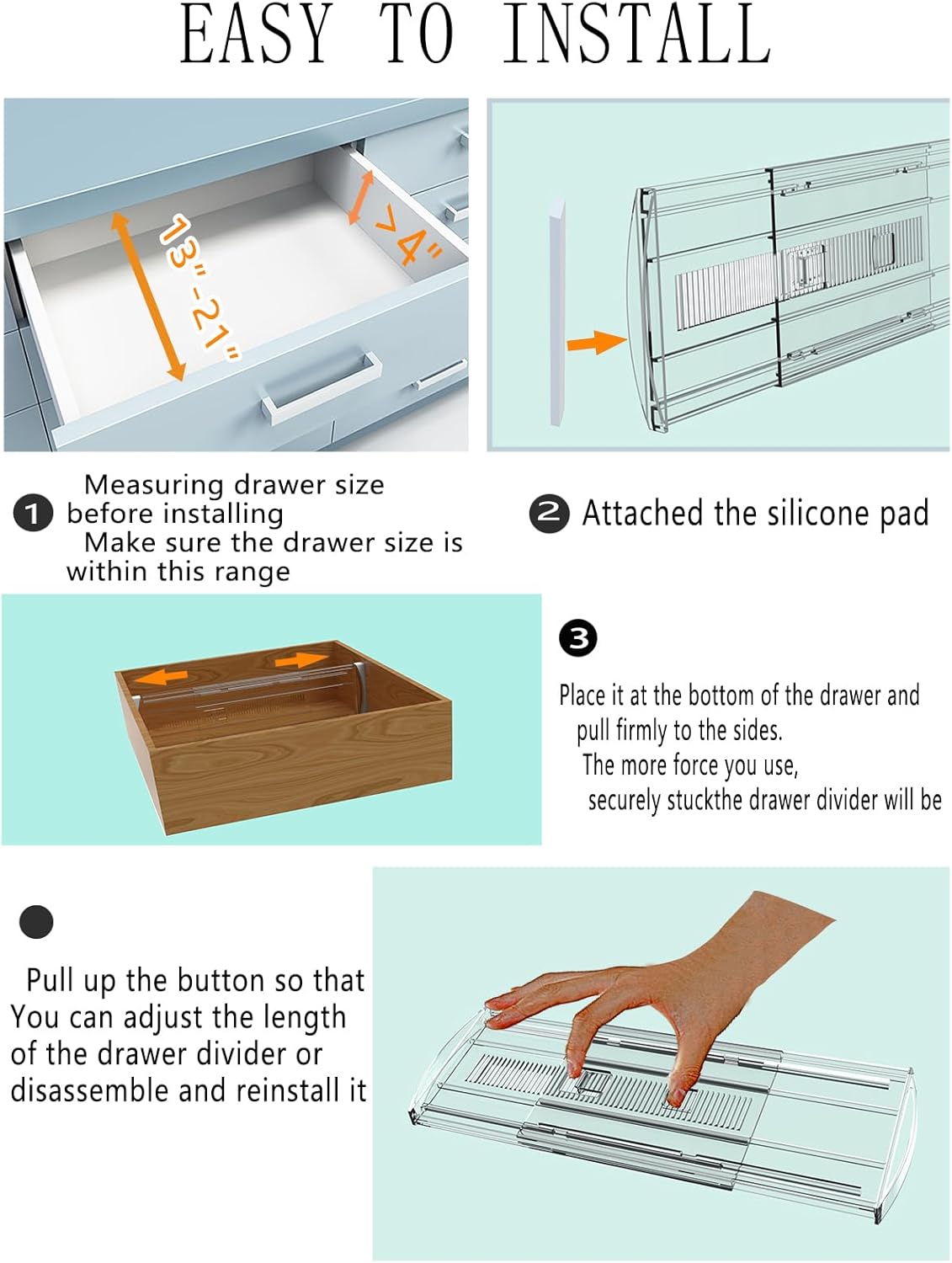 - 2:Easy to Use--1: Attach our matching silicone pad(Protect drawers from damage) 2:Place it at the bottom of the drawer and pull it forcefully on both sides. The harder you apply, Drawer Dividers Organizer the more firmly stand