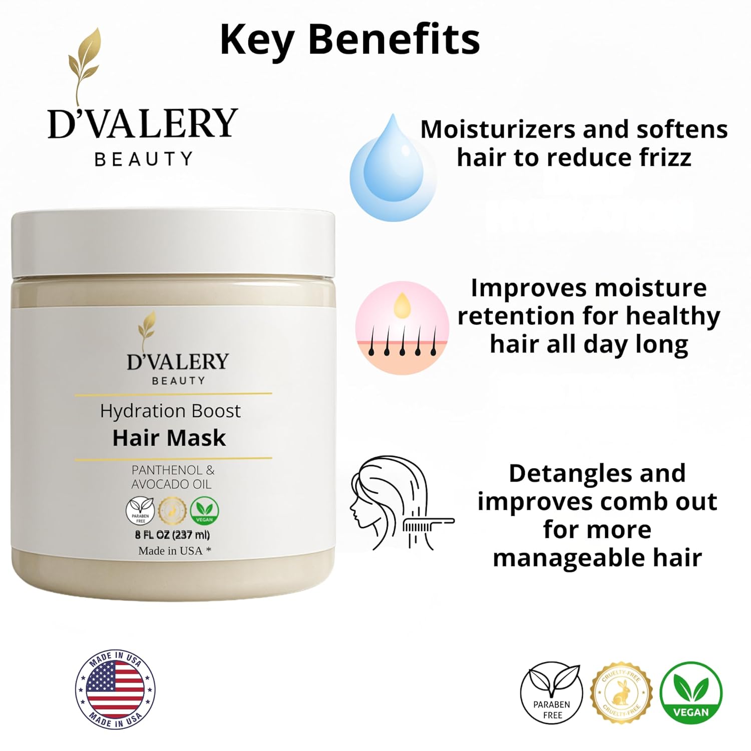 Hydrating Hair Mask with Avocado Oil & Panthenol – Deep Conditioning, Anti-Frizz & Detangling Treatment for Dry, Damaged or Color-Treated Hair – 8 oz