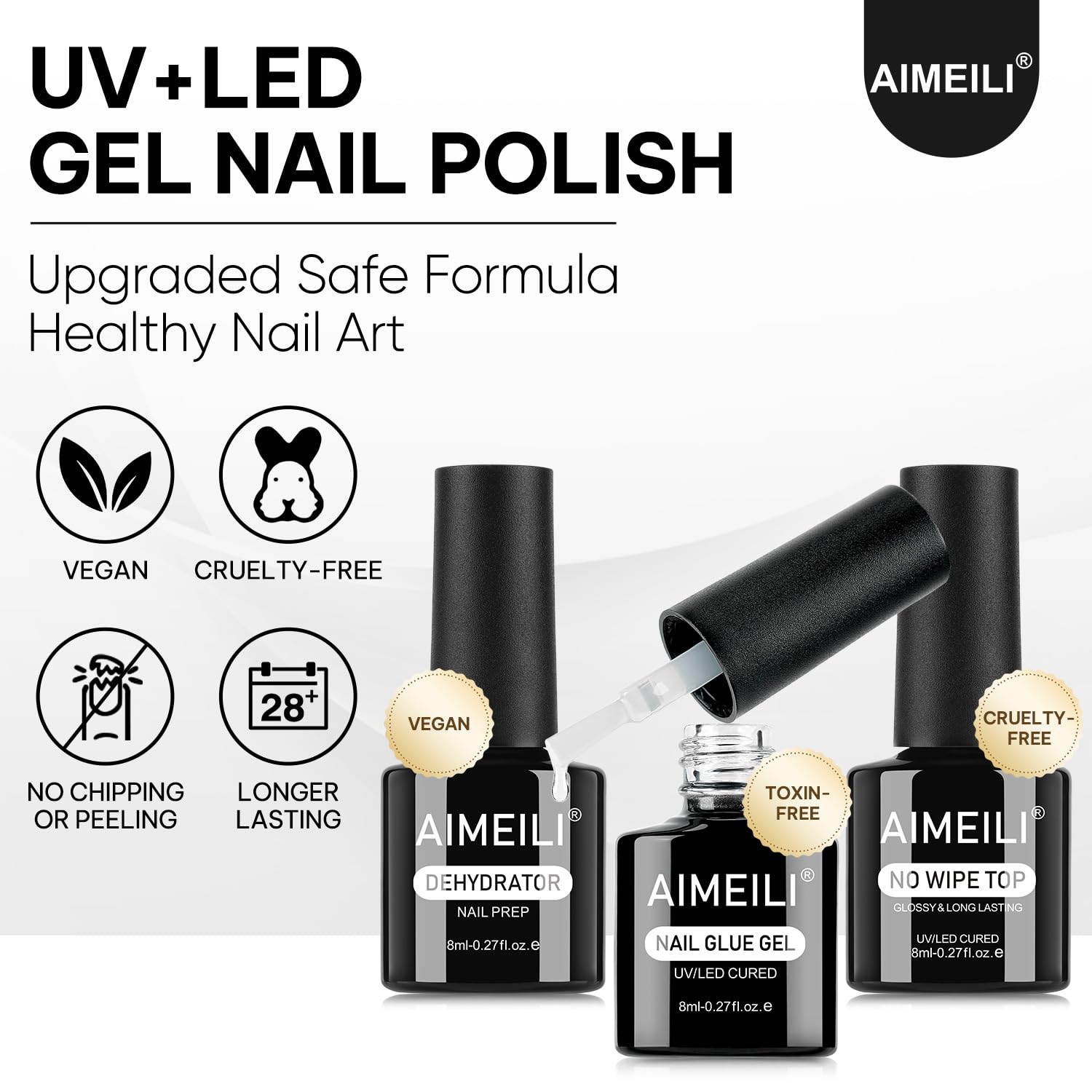 AIMEILI Nail Glue Gel with Top Coat and Prep Dehydrator 3 PCS, Hema Free, Cruelty Free, Vegan, Clear High Gloss Gel Nail Polish Long Lasting Nail Art