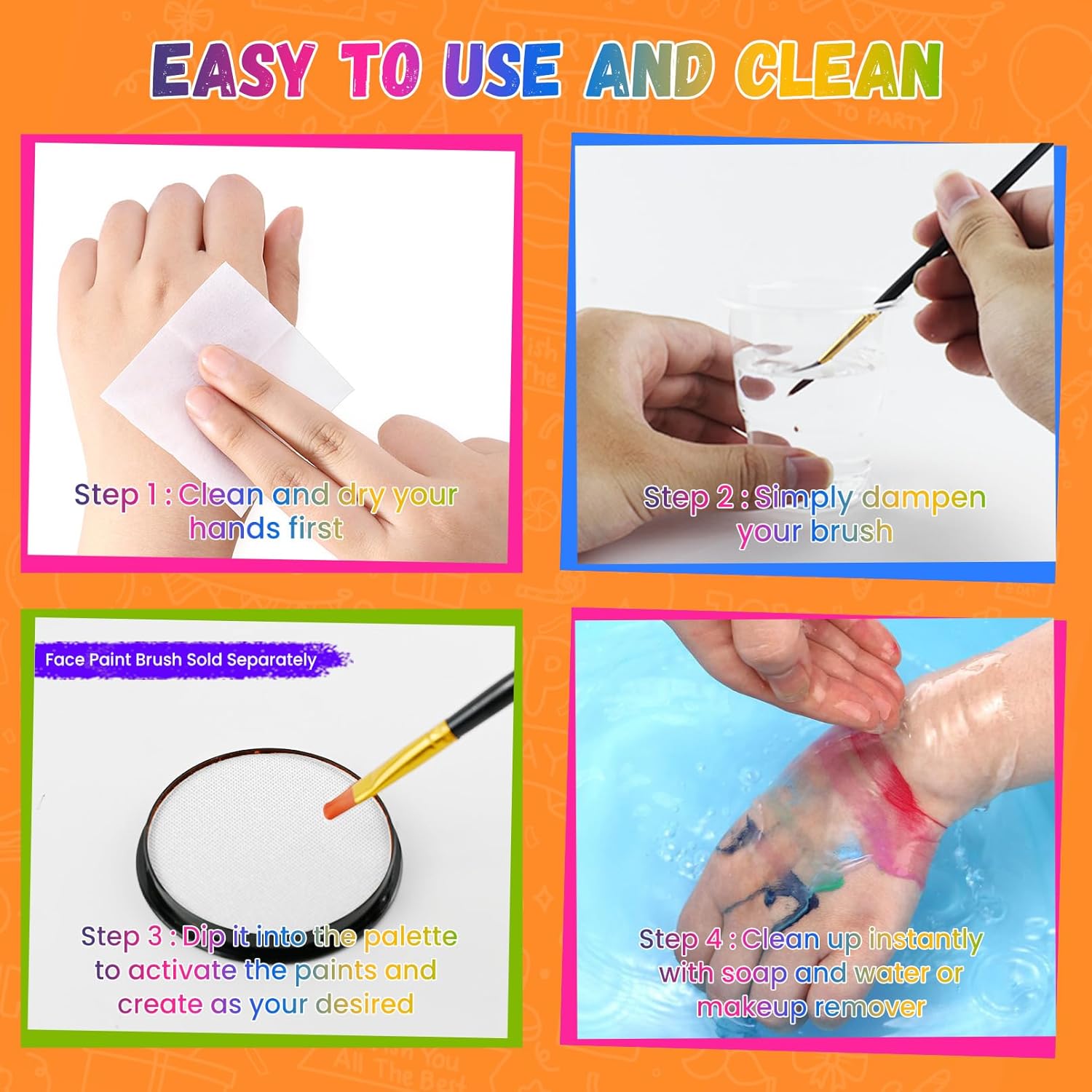 - Effortless Application & Removal: Create flawless face art with our water activated face paint: clean and dry your hands first and then simply dampen your brush and dip it into the palette to activate the paints, then create as your desired. Cleans up instantly with soap and water or makeup remover—no harsh scrubbing or staining residue. Before first use, we strongly recommend conducting a small patch test to ensure compatibility with your skin
