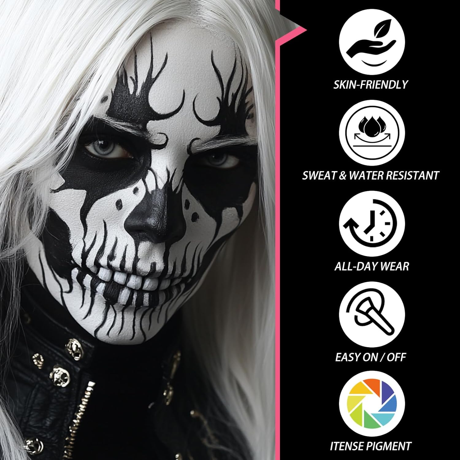 - Black Halloween Makeup - Our black face paint stick is the ultimate tool for spooky transformations. Easily create hollow skeleton eyes, zombie stitches, or spider-web patterns. perfect for creepy clown, mime, skull, vampire, monster, witch, gothic makeup look.