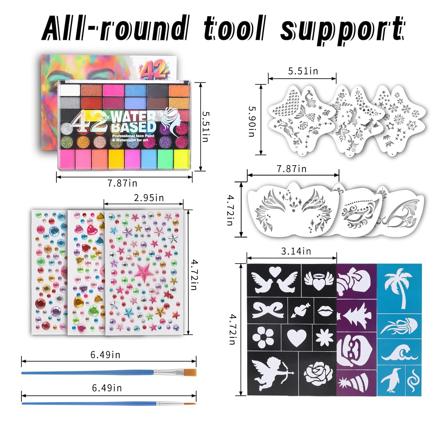 42 Color Face Paint Kit for Kids, Brushes, Sponges, Gems, Stickers, Non-Toxic Water-Based Makeup Palette Face Painting Kit for Kids Ideal Halloween, Parties, Festivals, Body Art & More