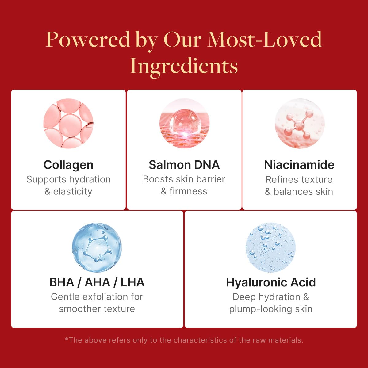 - [All You Need for a Radiant Holiday] Includes everything you need for a complete glow routine: Zero Pore Pad, Cleansing Oil, PDRN Capsule Cream, PDRN Serum, Collagen Wrapping Mask, and Collagen Jelly Cream.