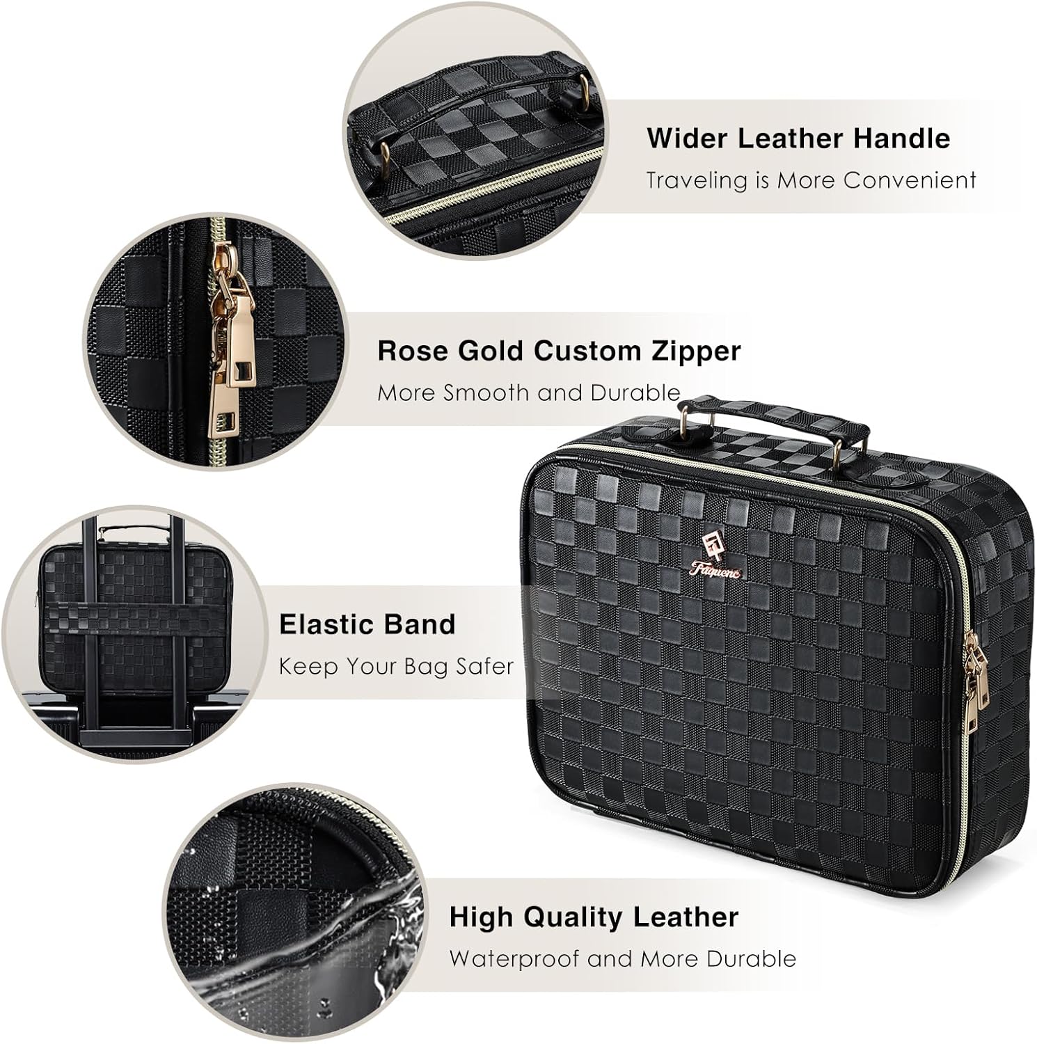 - 【HIGH-QUALITY TRAVEL COSMETIC CASE 】- The Faquenc makeup bag features a stylish black checkerboard pattern and a gold double zipper for easy opening. The handle has been upgraded to an ergonomic, rounded design to minimize strain during use. To accommodate travel needs, a luggage elastic strap has been added for convenient carrying. In addition, a Type-C data cable is included for convenient charging on the go.