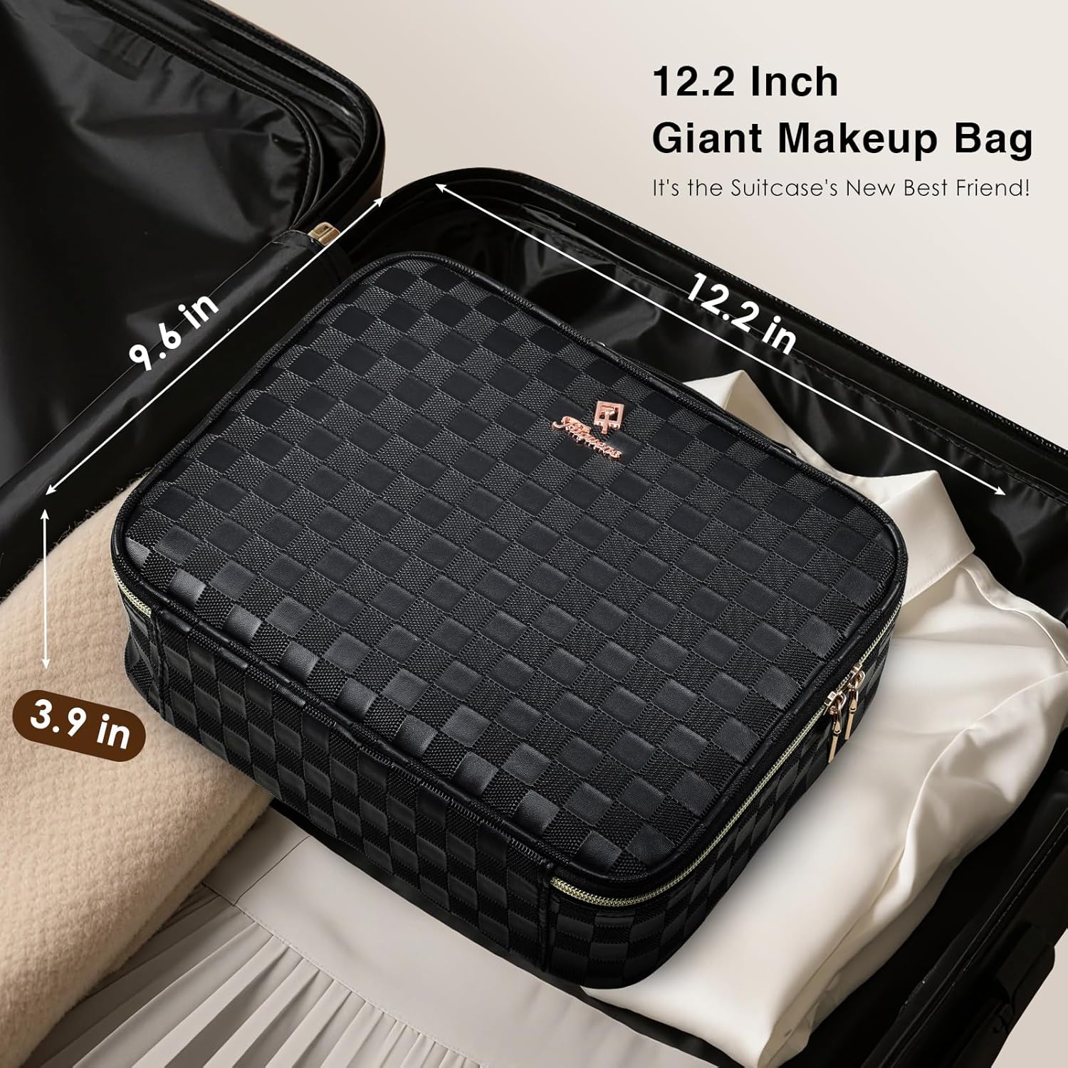Makeup Bag with LED Lighted Mirror 12.2 IN Travel Makeup Bag Adjustable Brightness in 3 Colors Cosmetic Organizer Artist Storage Bag with Dividers Brush Holder Bag Vanity Black Checkerboard