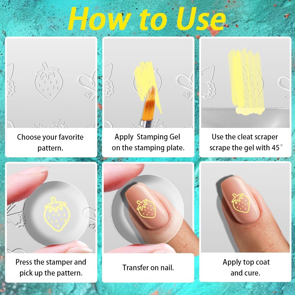- Easy to Use: 1. Apply paint adhesive to the stencil, then use the scraper to quickly scrape off the excess 2.Use silicone stamper to press down on the transfer pattern 3. Quickly transfer the pattern onto your nails 4.Bake dry to apply sealer then shine the lamp