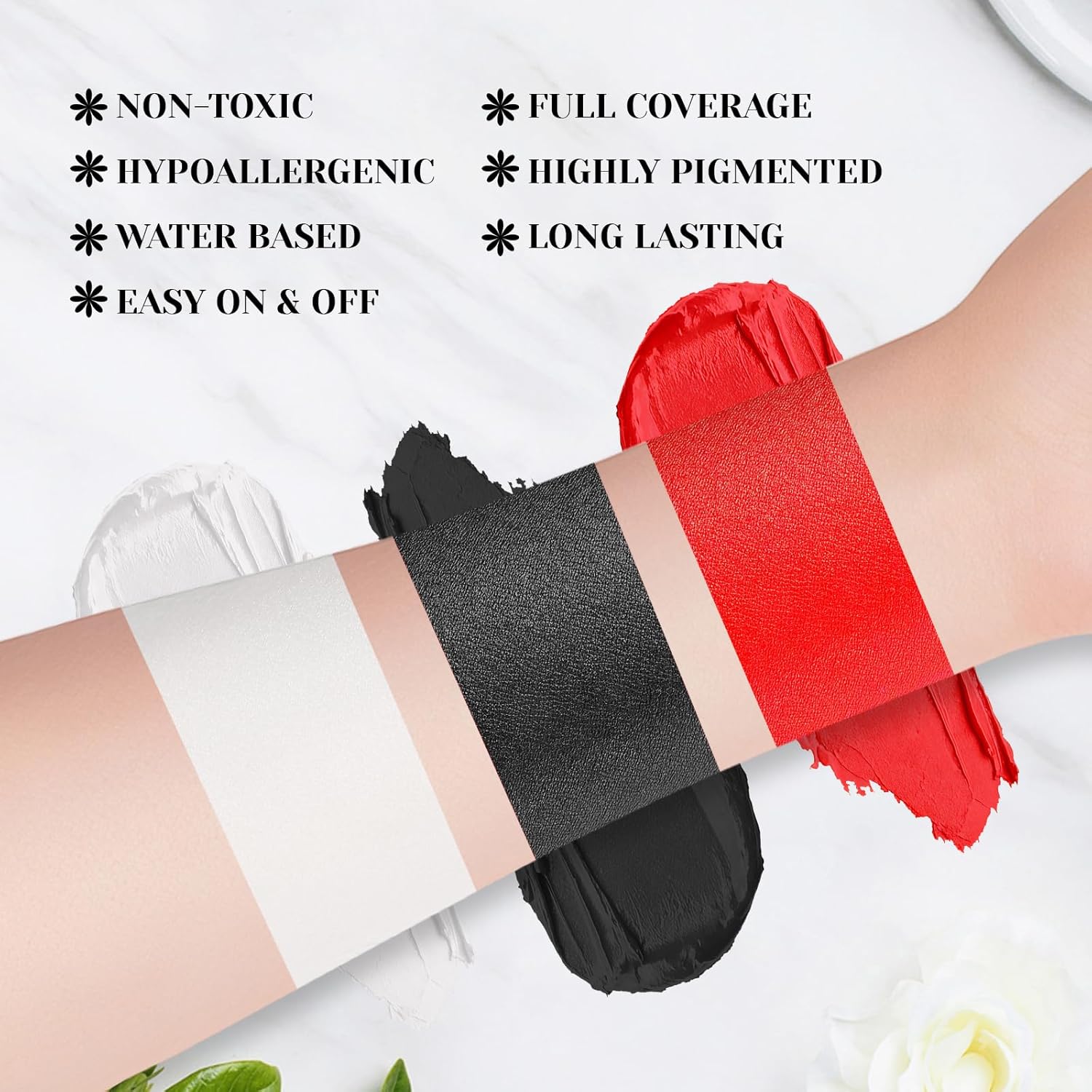 Black White Red Face Body Paint Stick Set with Translucent Setting Powder and Sponges, Professional Full Coverage Face Painting for Adults Halloween Cosplay SFX Spiderman Joker Devil Makeup