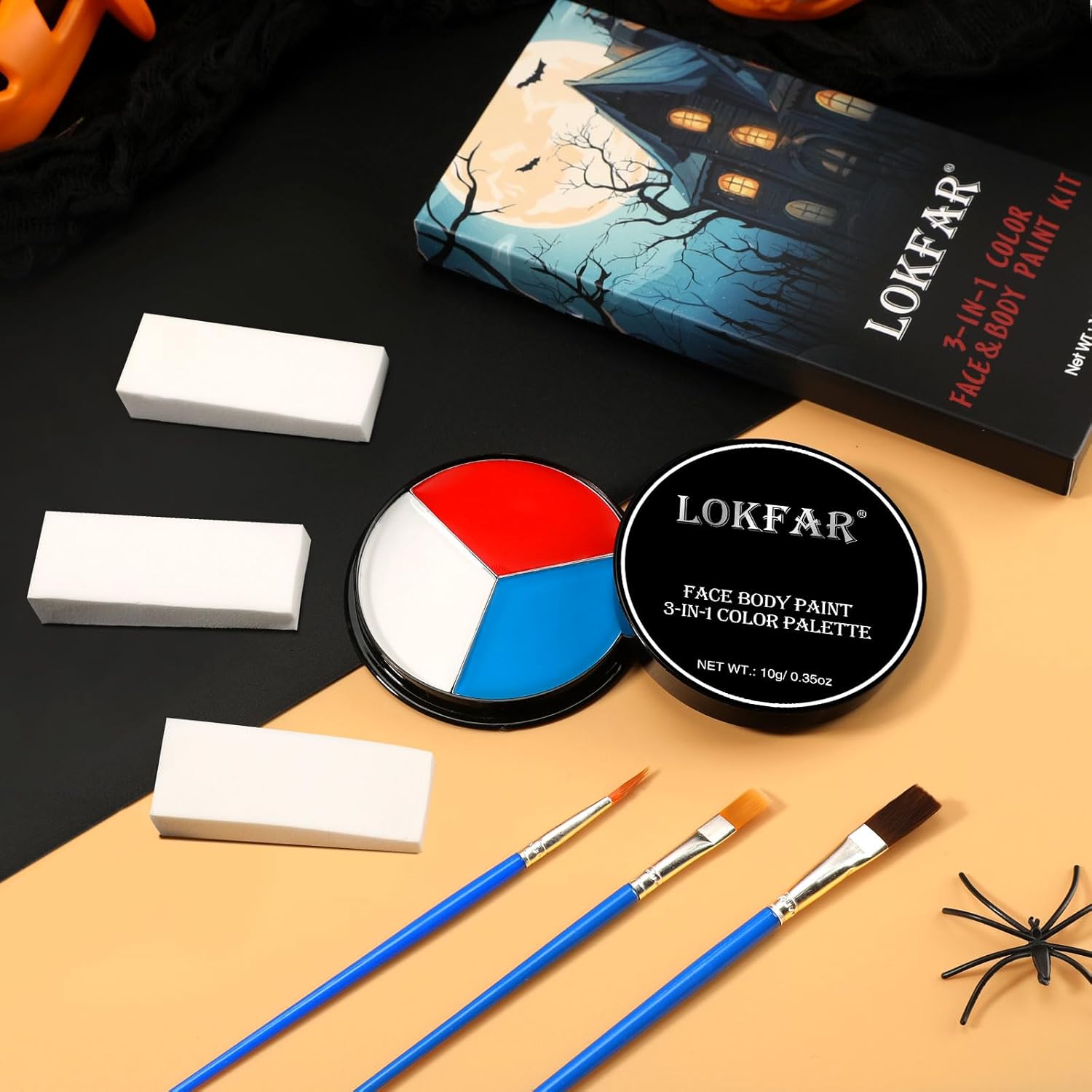 - PROFESSIONAL FACE BODY PAINT KIT -- This Halloween makeup kit contains Red, White, and Blue face paints, along with 3 professional makeup brushes with different tip sizes and 3 soft, skin-friendly stippling sponges, specially tailored for Halloween character makeup. It features a waterproof and sweat-resistant oil-based formula with high pigmentation. It is easy to apply and blend, and is resistant to fading, cracking, flaking, or caking. Easily create traditional Halloween costumes and various scary character looks.