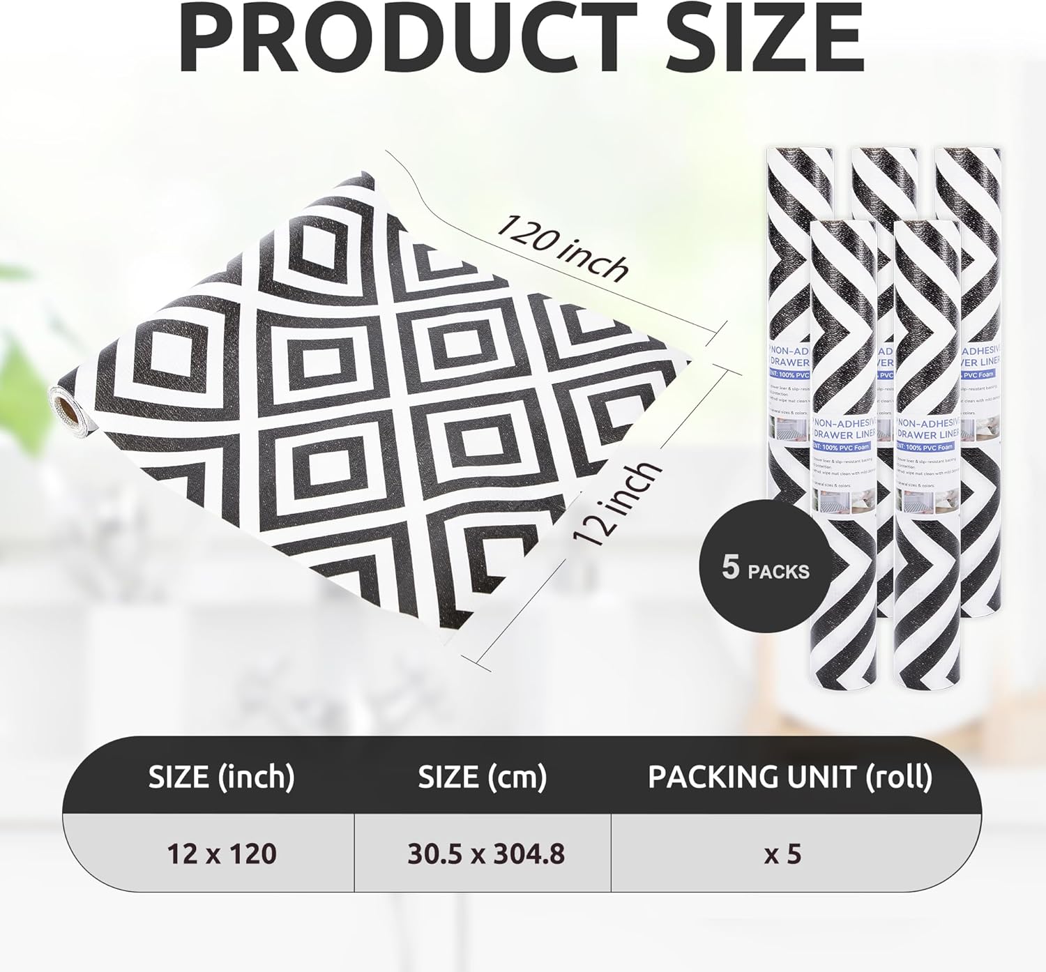 RAY STAR 12X120 Inch Shelf Liner for Kitchen Cabinets, Non-Adhesive Cabinet Liner Washable, PVC Drawer Liner for Dresser Non-Slip Bathroom (Modern Black)(5 Roll)