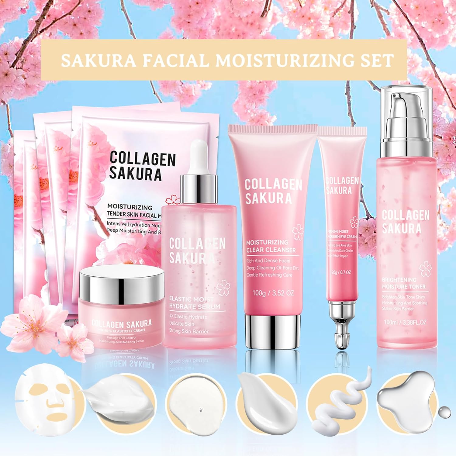 Sakura Skin Care Set,Moisturizing Skincare Kit with Face Cleanser,Facial Serum,Toner,Eye Cream,Face Cream and Hydrating Face Masks,Long-lasting Nourishing Skincare Set Facial Kit for Women(8pcs)