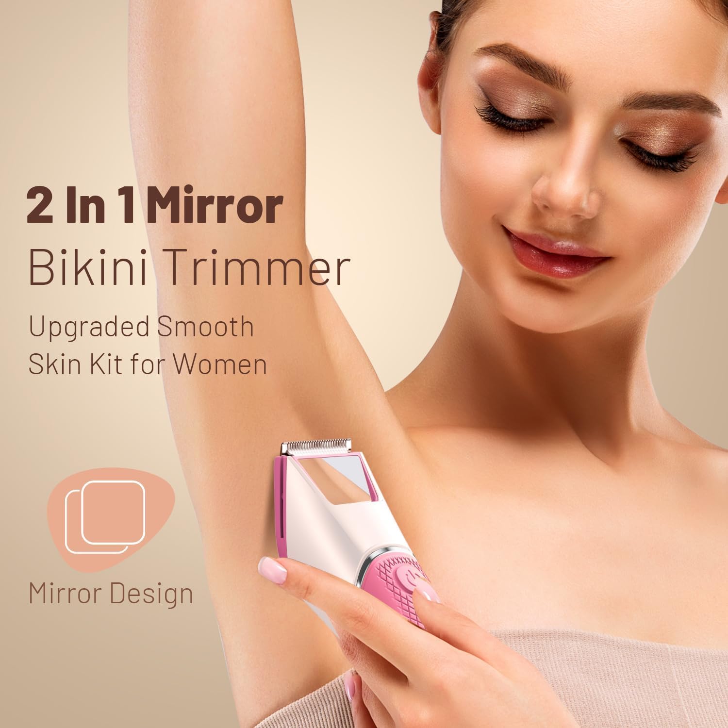 - New upgraded design: this women bikini trimmer for pubic hair features a unique mirror and LED light design, solving the blind spot of trimming body hair on various intimate parts , Perfect for split-second precision trimming women's bikini area, legs, underarms even sensitive areas and breasts, this will be your all-in-one solution for easy grooming anytime, anywhere.