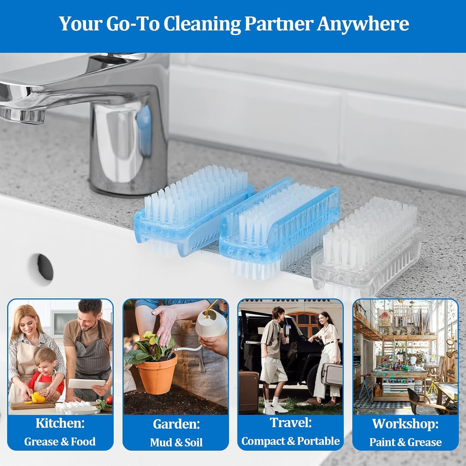 - 3-Pack Versatile Cleaning Tool: Our Nail Scrubber Brushes are perfect for cleaning dirt from your nails after gardening, cooking, or any dirty tasks. Ideal for home, office, kitchen, bathroom, and travel use.